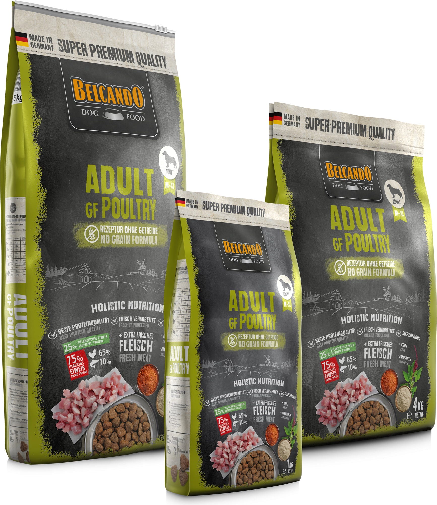 Toto suché krmivo vyrobené v Německu obsahuje čerstvou svalovinu z drůbeže a skládá se ze 75 % z živočišných a z 25 % z rostlinných bílkovin.