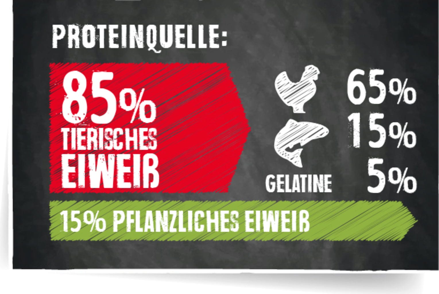 30 % čerstvé drůbeží maso, 21 % drůbeží protein s nízkým obsahem popelovin, sušený, kukuřice, Rýže, 6 % mořská rybí moučka, drůbeží tuk, rostlinné oleje[1], 2,5 % sušená vejce, 2,5 % hydrolyzovaná želatina, 2,5 % výlisky z hroznových jader, pivovarské kvasnice inaktivované a sušené, sušená karobová mouka, odcukerněné sušené řepné řízky, chia semínka, hydrolyzovaná drůbeží játra, fosforečnan vápenatý, chlorid sodný, chlorid draselný, sušené bylinky[2], Yucca schidigera