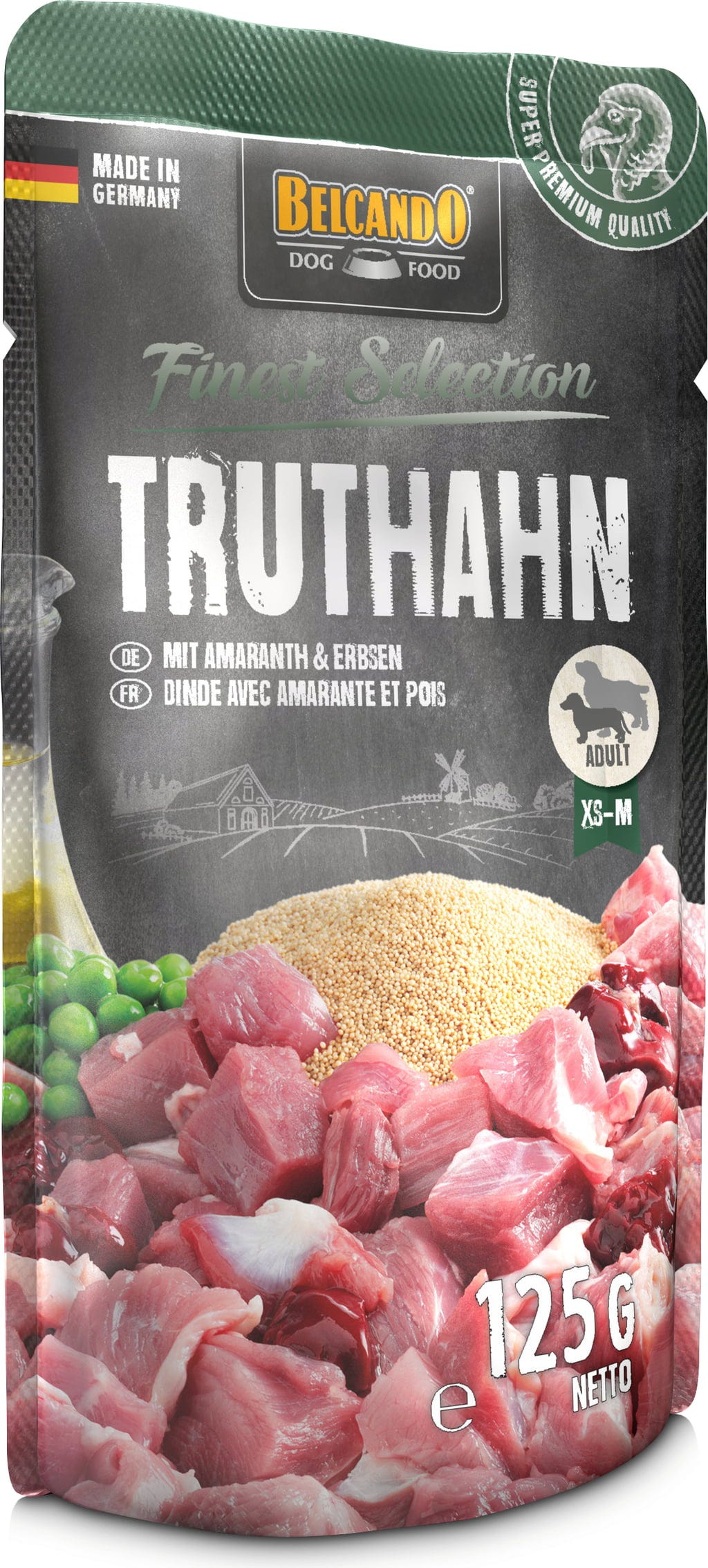 Kulinářské menu pro extra hladové gurmány: Belcando® - kapsičky obsahují to, co psi milují! Šetrně vařené šťavnaté kousky krůtího masa se snoubí s amarantem a hráškem. S každým soustem zažijete symfonii chutí! S bohatým obsahem esenciálních nenasycených mastných kyselin z bodlákového oleje lisovaného za studena.