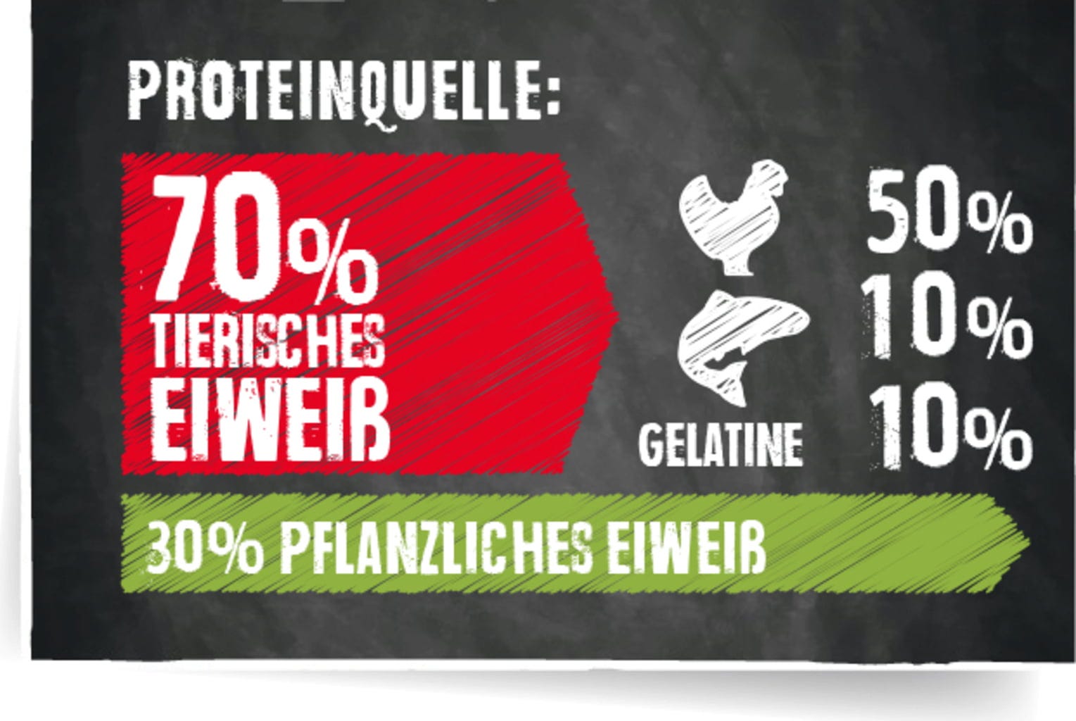 - 70 % živočišných bílkovin z drůbeže, ryb a želatiny.