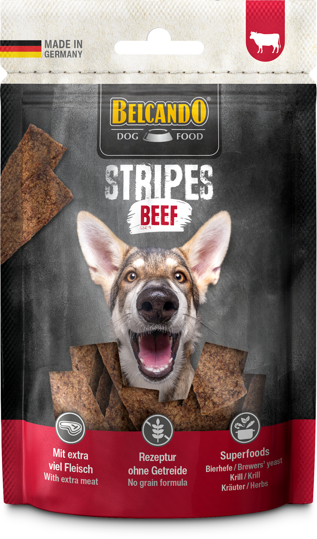 Tyto chutné Stripes obsahují obzvláště velké množství lahodného hovězího masa a byly obohaceny o superpotraviny, jako jsou pivovarské kvasnice, krill a bylinky.