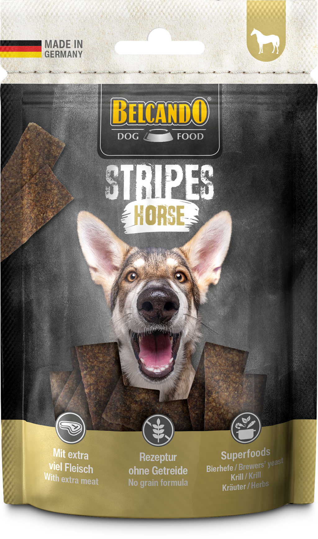 Jsou bohaté na koňské maso a byly vylepšeny o superpotraviny bohaté na vitální látky a živiny, jako jsou pivovarské kvasnice a 0,8 % krillu. Bylinky jako kořen hořce, heřmánek a ostružinové listy dodávají Stripes to pravé. Šetrně sušené vzduchem a vyrobené v Německu, tvoří lahodný snack!