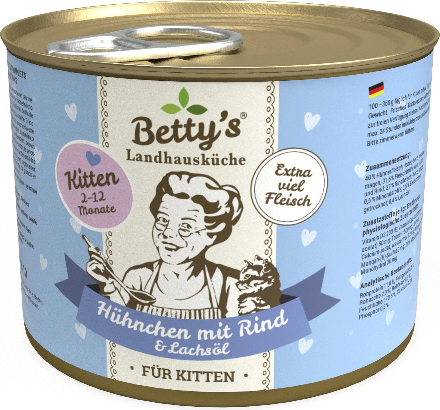 Kitten Landhausküche kuřecí & hovězí je ideálním jídlem pro dospívající koťata a podporuje je v jejich každodenních dobrodružstvích v 1. roce života. Lahodná kombinace kuřecího a hovězího masa, lososového oleje a taurinu obsahuje všechny důležité živiny a minerální látky, aby co nejlépe podpořila malé uličníky na jejich cestě k samostatnosti.