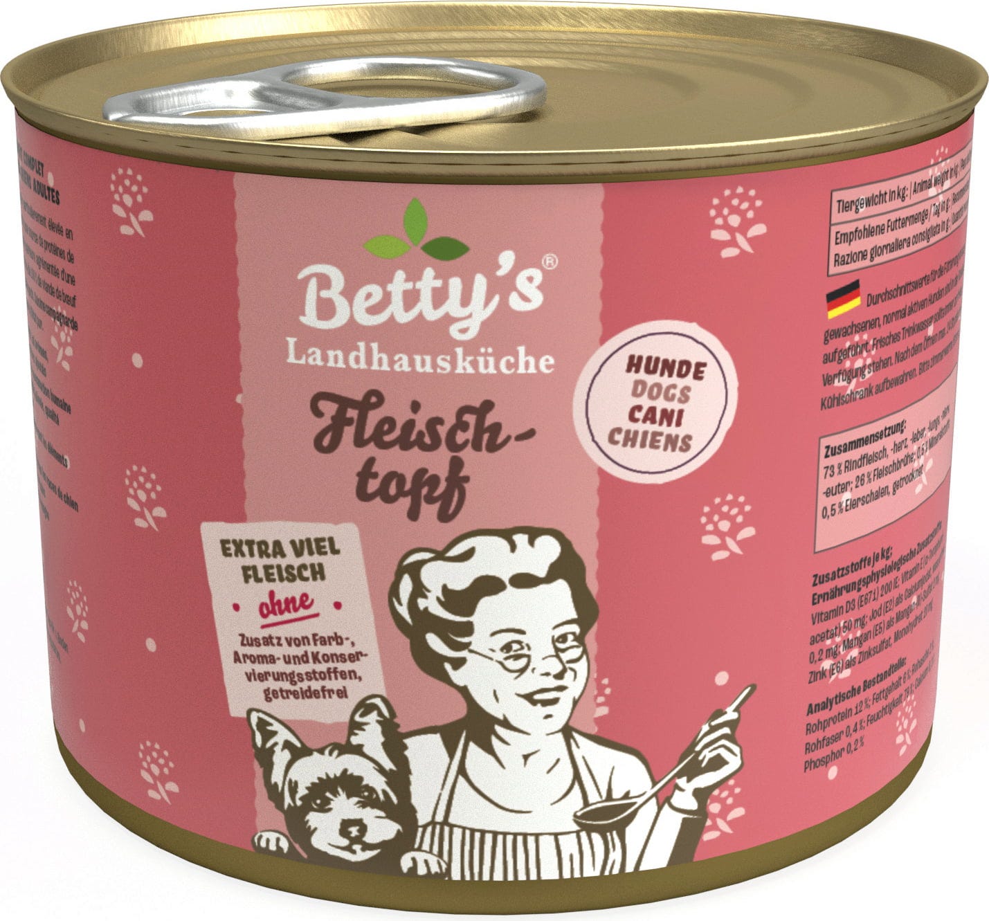 Betty's Landhausküche Masové menu poskytuje obzvláště vysoký podíl živočišných bílkovin s vynikající chutí čistého hovězího masa, které pochází z německých zemědělských podniků. Kromě 73% podílu masa nesmí chybět ani důležité minerální látky. Sušené vaječné skořápky navíc fungují jako přírodní zdroj vápníku. Který pes by dokázal odolat takové pochoutce?