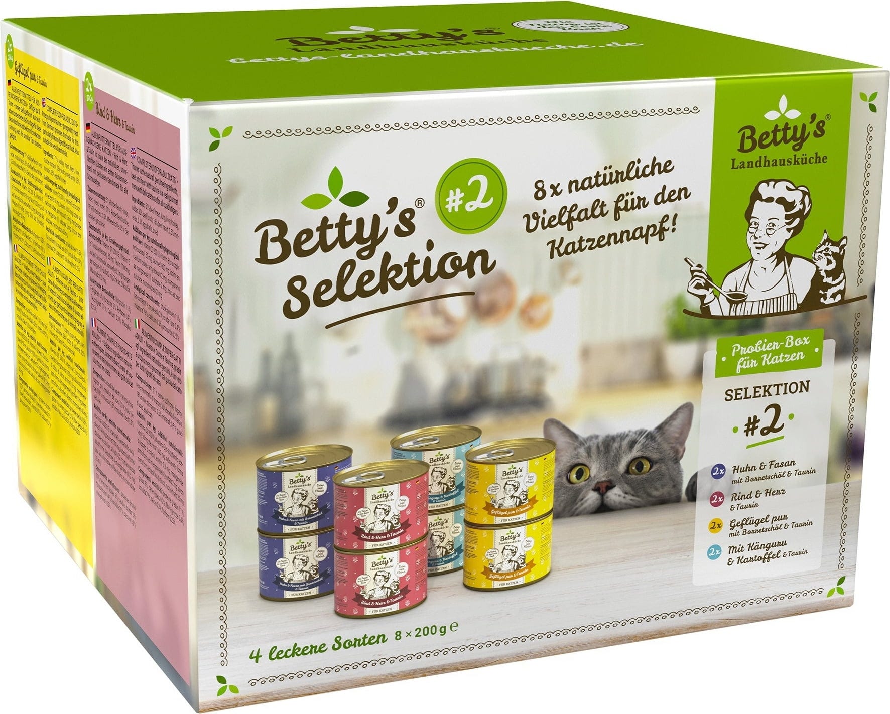 Je čas na mňoukání – ke misce se prosím dostavte! V tomto zkušebním boxu Betty’s Landhausküche najdete 4 různé konzervy s neodolatelnými příchutěmi pro kočičí gurmány: