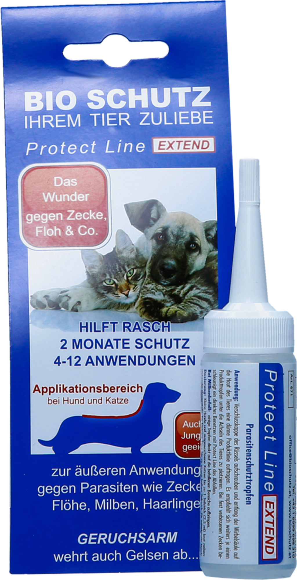 Bio Schutz Protect Line Extend je tekutý repelent pro psy a kočky s účinnou látkou geraniol. Účinně odpuzuje parazity, jako jsou klíšťata nebo blechy, a zároveň odstraňuje již existující napadení. Tekutina má jemnou vůni a je voděodolná. Účinná látka neproniká do krevního oběhu.