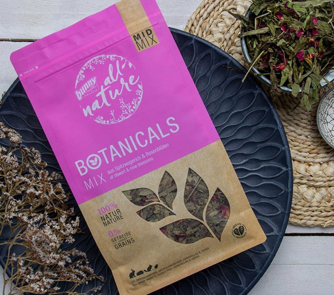 Zvolte bunny Botanicals MAXI MIX jako hlavní složku a bunny Botanicals MID MIX jako doplněk a smíchejte je ve správném poměru. Přidejte navíc bunny all nature VitamínE a získáte individuálně přizpůsobené, kvalitní strukturální kompletní krmivo bez pelet a extrudátů. Tak zajistíte svým zvířatům vyváženou, přirozenou a vhodnou výživu.