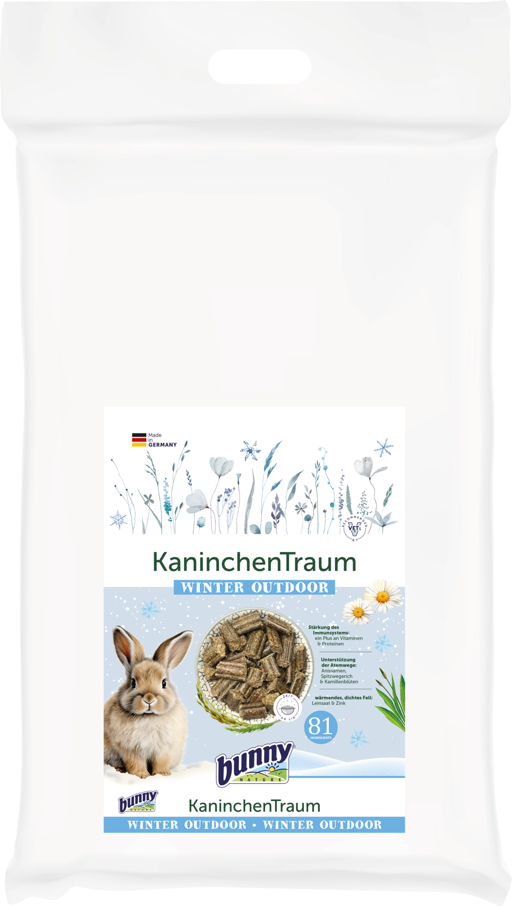 Když se sny zakrslých králíků stanou skutečností… toto chutné krmivo není daleko! Toto kvalitní kompletní krmivo bylo vyvinuto speciálně pro zakrslé králíky, kteří tráví zimu venku, a díky cenným složkám podporuje normálně hustou srst, správnou funkci dýchacích cest i imunitního systému. Zároveň přináší chutné zpestření do krmné misky a poskytuje Vašim mazlíčkům druhově vhodné a plnohodnotné živiny.