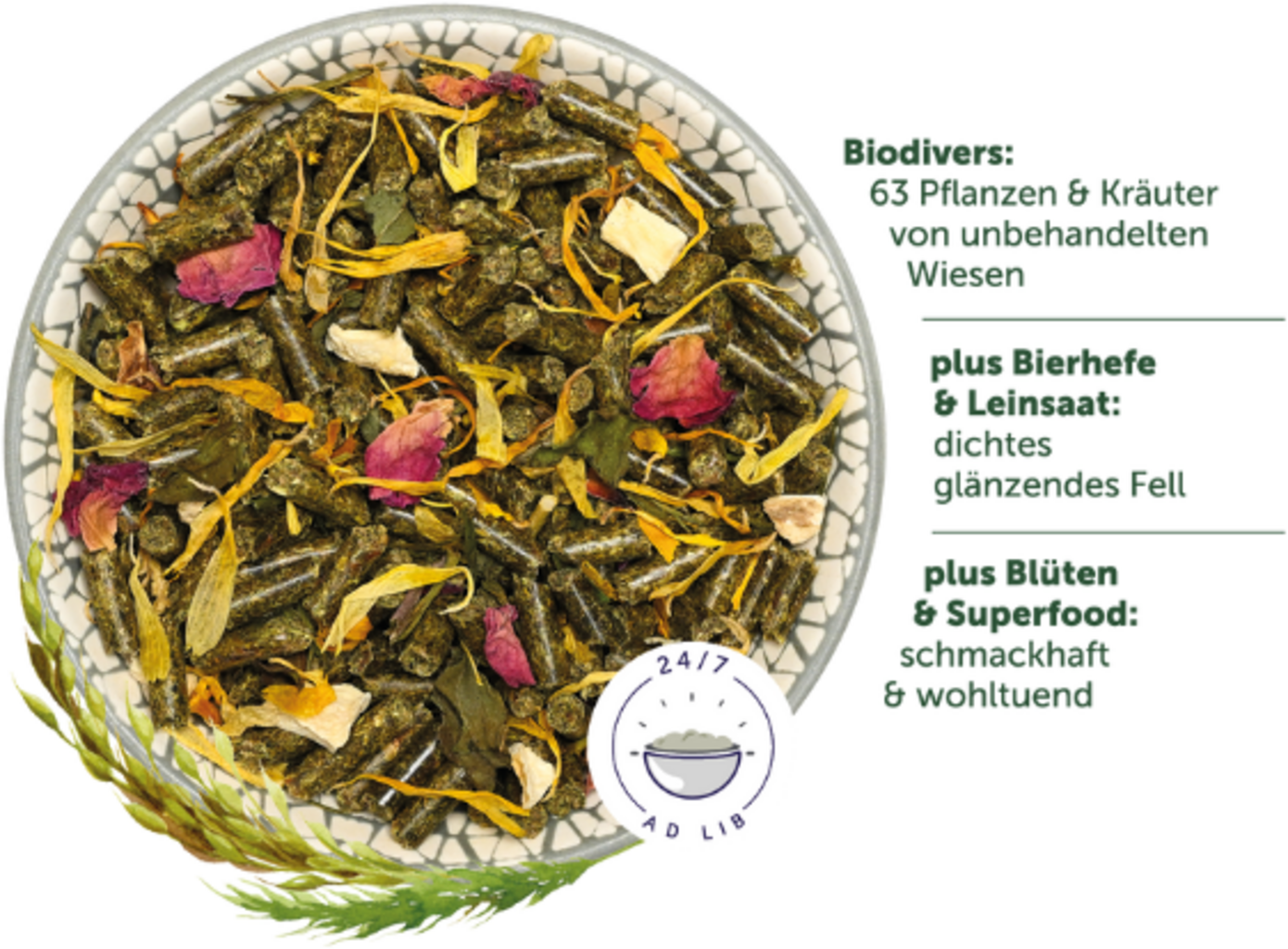 vegetace trvalých luk a pastvin (timothy, kostřava, kostřava, psárka luční, lipnice luční, srha laločnatá, kerblík luční, pampeliška drsnolistá, hrachor luční, řebříček, kontryhel, tomkovice vonná, jetel rolní, jitrocel, šalvěj luční, smělka ladní, sveřep vzpřímený, zvonek rozkladitý, kmín kořenný, chrpa luční, rožec obecný, pcháč rolní, jílek měkký, pampeliška, metlici trsnatá, tužebník jilmový, rožec rolní, lesní jahody, vikev ptačí, rozrazil ožankový, pampeliška drsnolistá, svízel syřišťový, oves pýřitý, štírovník růžkatý, přeslička rolní, svízel bílý, kakost bílý, kopretina bílá, hlaváč rolní, kohoutek luční, kyprej vrbice, rozrazil polní, ovsík vyvýšený, lipnice luční (Poa pratensis), jitrocel (Plantago media), krvavec (Sanguisorba officinalis), vikev úzkolistá, pomněnka rolní, lomikámen zrnitý, bedrník obecný, mochna plazivá, prvosenka jarní, silena nicí, krvavec menší, ptačinec trávovitý, kozí brada luční, kopřiva dvoudomá, rozrazil mateřídouškový, jetel, vikev plotní, zběhovec ženevský, bršlice kozí noha, sedmikráska), celá kukuřice, timothy, slunečnicová mouka, pšeničné otruby, lněný šrot, lupina - celá rostlina, ovesné otruby, řepkový extrahovaný šrot, mláto, lignocelulóza, 1,5 % sušené inaktivované pivovarské kvasnice, pšeničné klíčky, 1 % lněná semínka, bramborový protein, pastinák, stonky petržele, kořeny čekanky, okvětní lístky růží, květy měsíčku, listy máty peprné, topinambur, inulin z čekanky, amarant, heřmánek, listy jitrocele, pampeliška, semena fenyklu, květy heřmánku, ostropestřec mariánský, Maca kořen, šalvěj (2 % zelenina, 2 % květy)