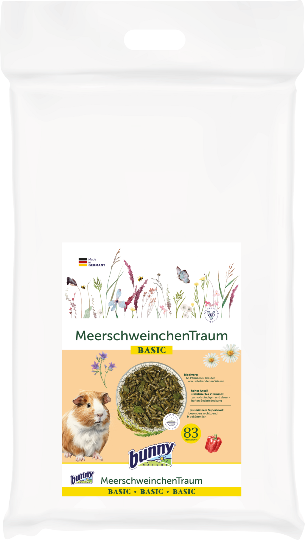 Když se sny morčat stanou skutečností… toto chutné krmivo není daleko! Díky 63 různým rostlinám z chemicky neošetřených luk, stabilizovanému vitamínu C, mátě, quinoe, amaranthu, aoniovým bobulím a mace přináší lahodné zpestření do krmné misky a umožňuje kvalitní, druhově vhodnou výživu Vašich mazlíčků.