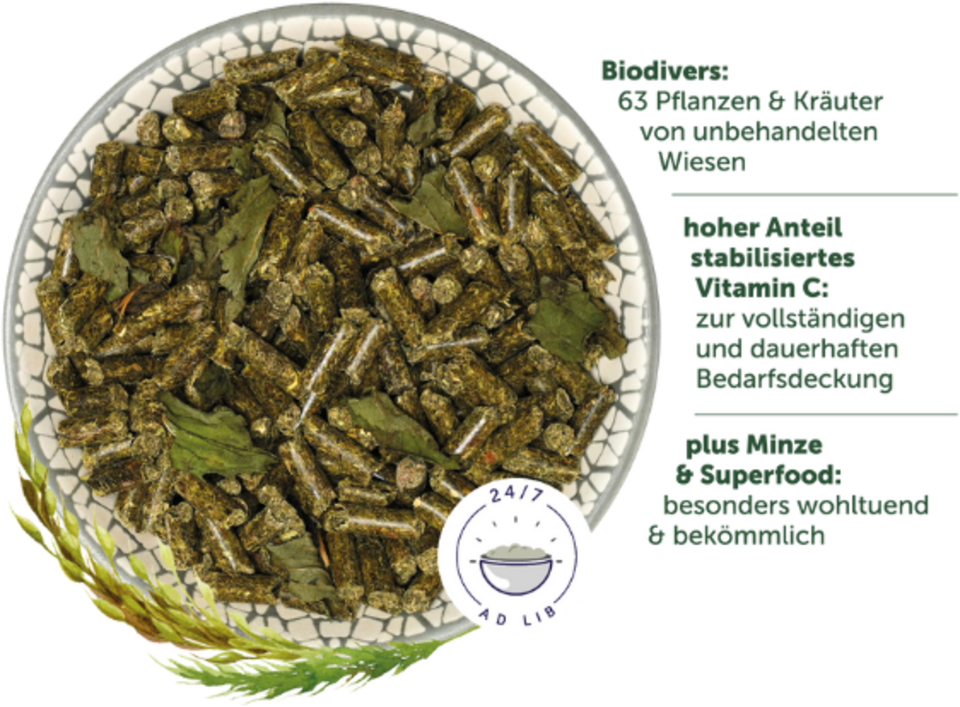 vegetace trvalých luk a pastvin (timothy, kostřava, kostřava, psárka luční, lipnice luční, srha laločnatá, kerblík luční, pampeliška drsnolistá, hrachor luční, řebříček, kontryhel, tomkovice vonná, jetel rolní, jitrocel, šalvěj luční, smělka ladní, sveřep vzpřímený, zvonek rozkladitý, kmín kořenný, chrpa luční, rožec obecný, pcháč rolní, jílek měkký, pampeliška, metlici trsnatá, tužebník jilmový, rožec rolní, lesní jahody, vikev ptačí, rozrazil ožankový, pampeliška drsnolistá, svízel syřišťový, oves pýřitý, štírovník růžkatý, přeslička rolní, svízel bílý, kakost bílý, kopretina bílá, hlaváč rolní, kohoutek luční, kyprej vrbice, rozrazil polní, ovsík vyvýšený, lipnice luční (Poa pratensis), jitrocel (Plantago media), krvavec (Sanguisorba officinalis), vikev úzkolistá, pomněnka rolní, lomikámen zrnitý, bedrník obecný, mochna plazivá, prvosenka jarní, silena nicí, krvavec menší, ptačinec trávovitý, kozí brada luční, kopřiva dvoudomá, rozrazil mateřídouškový, jetel, vikev plotní, zběhovec ženevský, bršlice kozí noha, sedmikráska), timothy, ovesné otruby, slunečnicová mouka, celá kukuřice, mrkvové výlisky, lněný šrot, řepkový extrahovaný šrot, mláto, mrkev, lignocelulóza, sušené inaktivované pivovarské kvasnice, lněná semínka, paprika, 0,6 % listy máty peprné, inulin z čekanky, amarant, výlisky z bobulí arónie, semínka quinoa, heřmánek, Maca kořen