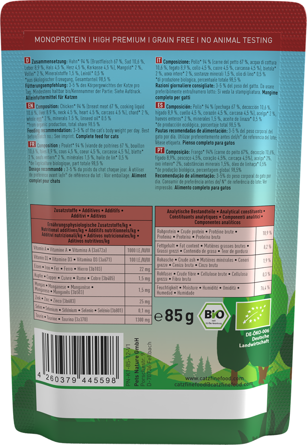 Vlastnosti produktu: bez barviv, bez genetického inženýrství, bez kostní a masové moučky, bez konzervantů, bez umělých barviv, bez umělých barviv a atraktantů, bez umělých příchutě, bez obilovin, monoproteinové, netestováno na zvířatech