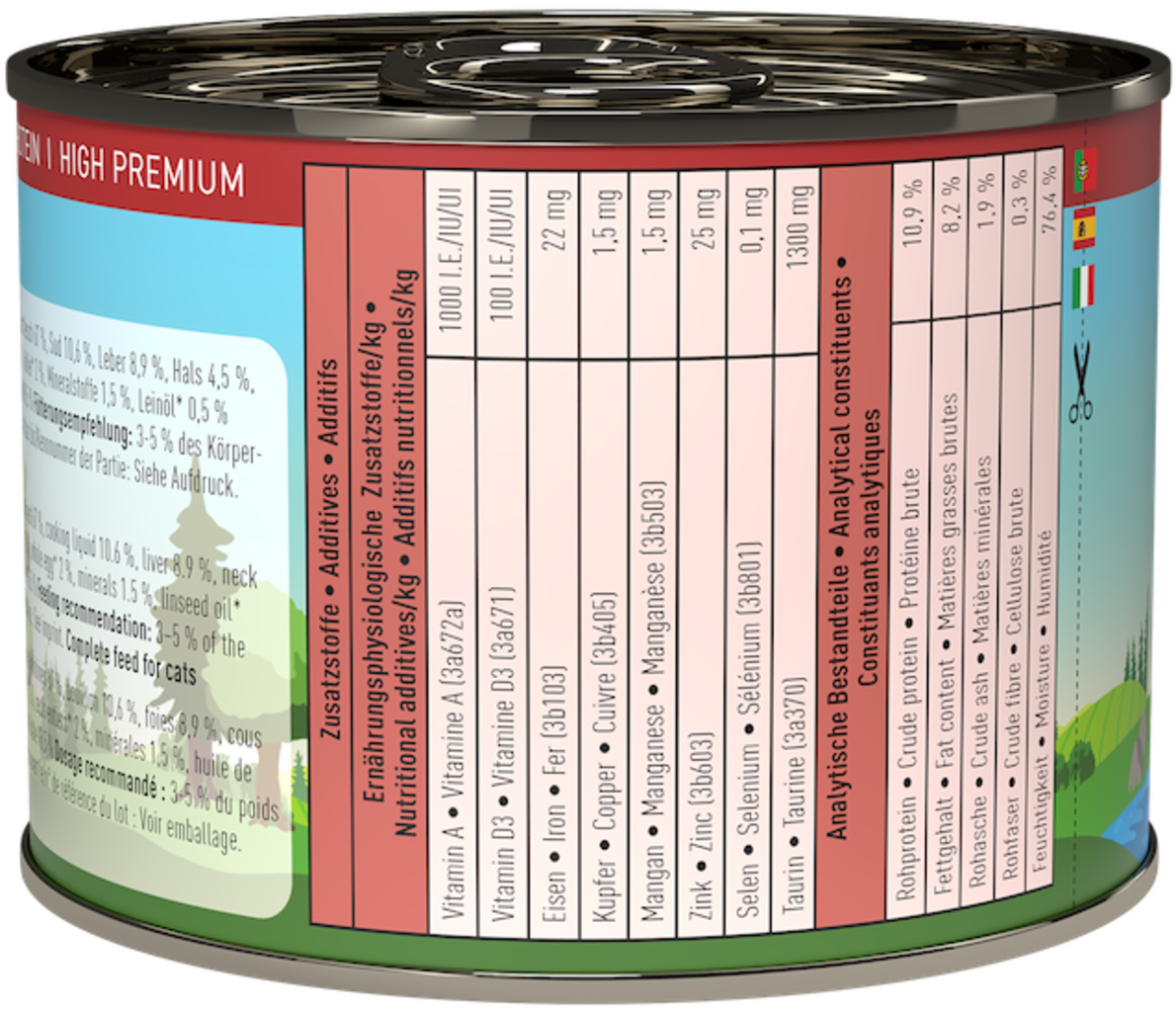 - Více než 94% podíl masa, ryb, mořských plodů, vnitřností a vývaru, doplněný nízkým podílem zeleniny, ovoce a dalších složek vhodných pro kočky