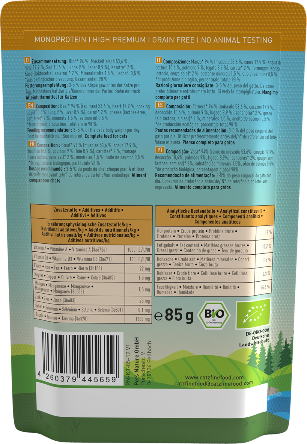 Toto vysoce kvalitní monoproteinové mokré krmivo v bio kvalitě nabízí Vaší kočce požitek blízký přírodě a odpovídající jejím potřebám. Vybrané bio suroviny a speciální receptura založená na konceptu kořisti poskytují Vaší kočce vše, co potřebuje, a přispívají tak zásadním dílem k vitálnímu životu kočky.