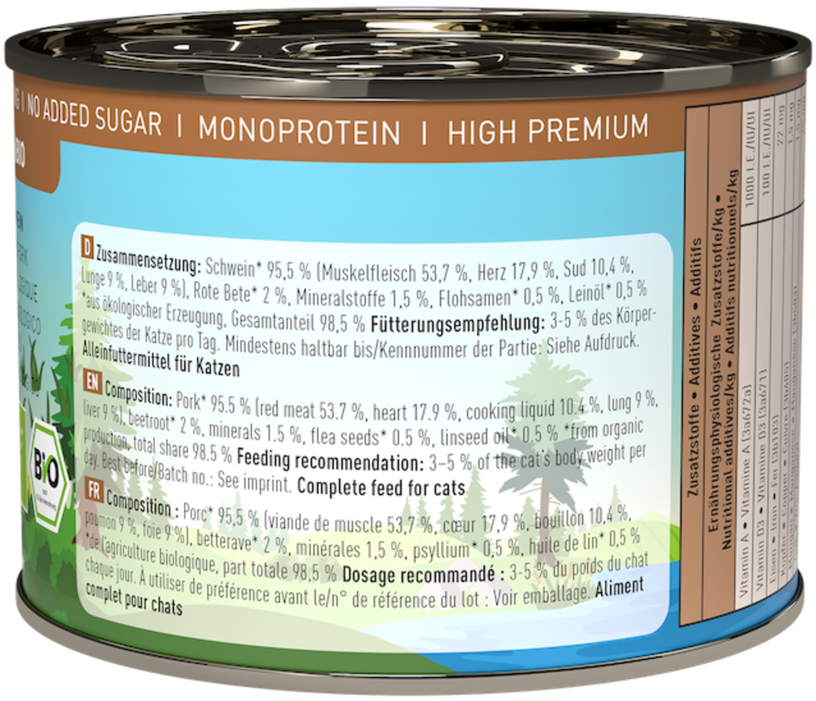 Toto vysoce kvalitní monoproteinové mokré krmivo v bio kvalitě nabízí vaší kočce přirozený požitek odpovídající jejím potřebám. Vybrané bio ingredience a speciální receptura založená na konceptu kořisti poskytují vaší kočce vše, co potřebuje, a přispívají tak zásadním dílem k jejímu vitálnímu životu.