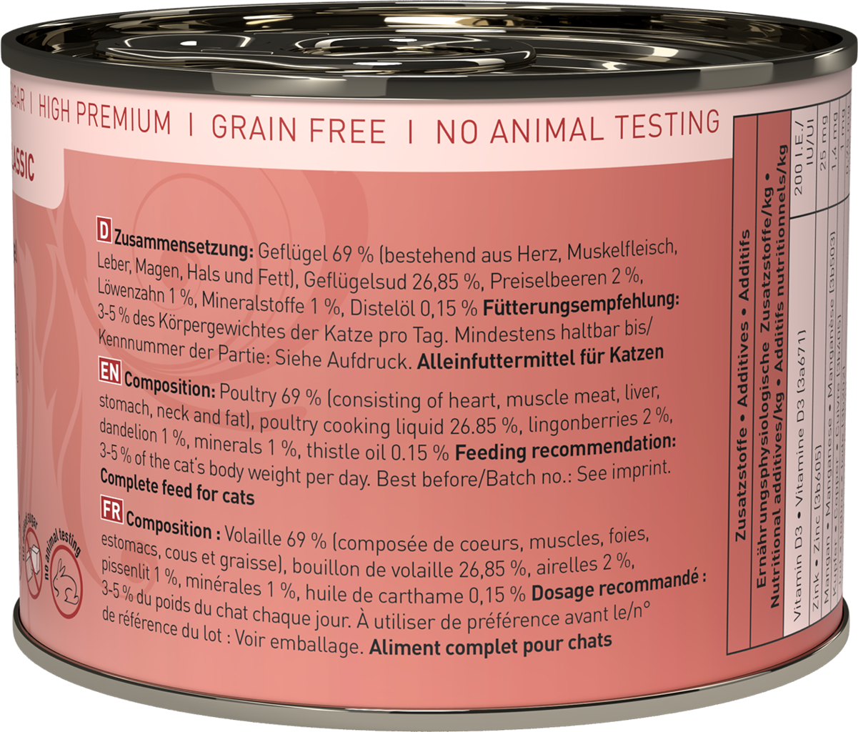 S tímto prémiovým mokrým krmivem můžete své kočce dopřát něco zcela výjimečného a hýčkat ji vybranými přírodními ingrediencemi ve vynikající kvalitě a s exkluzivní chutí. Toto krmivo, sestavené podle konceptu kořisti, respektuje přirozenost Vaší kočky a vrací jí tak kousek původní kvality života.