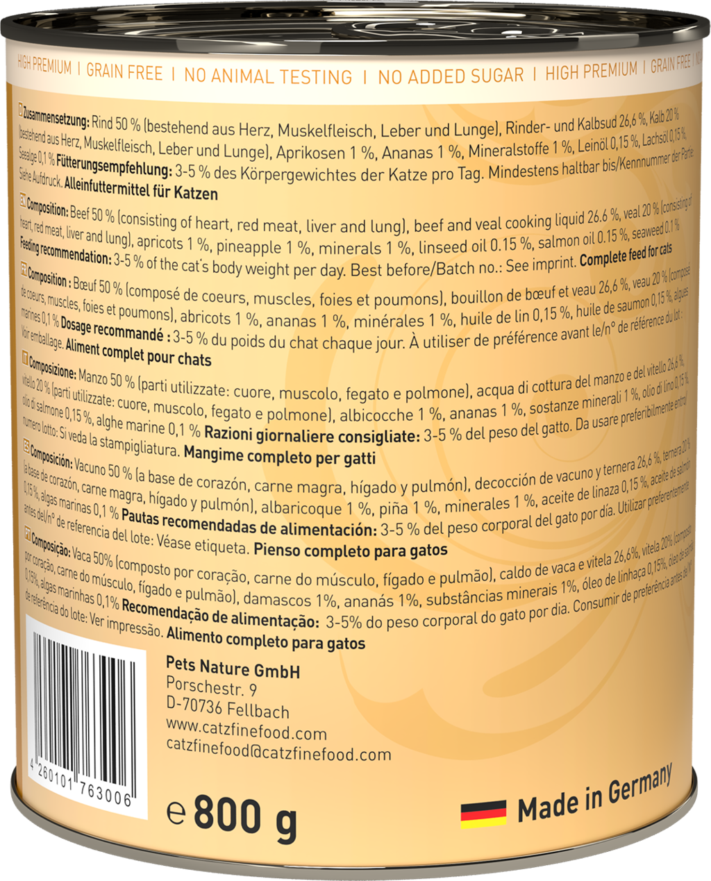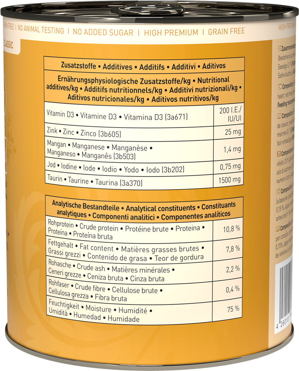 50 % hovězí maso (srdce, svalovina, játra, plíce), 26,6 % hovězí a telecí vývar, 20 % telecí maso (srdce, svalovina, játra, plíce), 1 % meruňka, 1 % ananas, 1 % minerály, 0,15 % lněný olej, 0,15 % lososový olej, 0,1 % mořské řasy