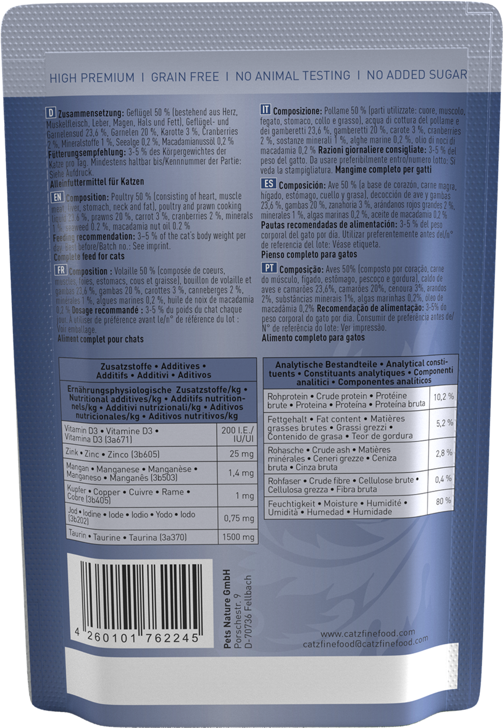 50 % drůbež (srdce, svalovina, játra, žaludek, krk, tuk), kuřecí vývar, 23,6 % krevetový vývar, 20 % garnát, 3 % mrkev, 2 % brusinky, 1 % minerály, 0,2 % mořské řasy, 0,2 % olej z makadamových ořechů