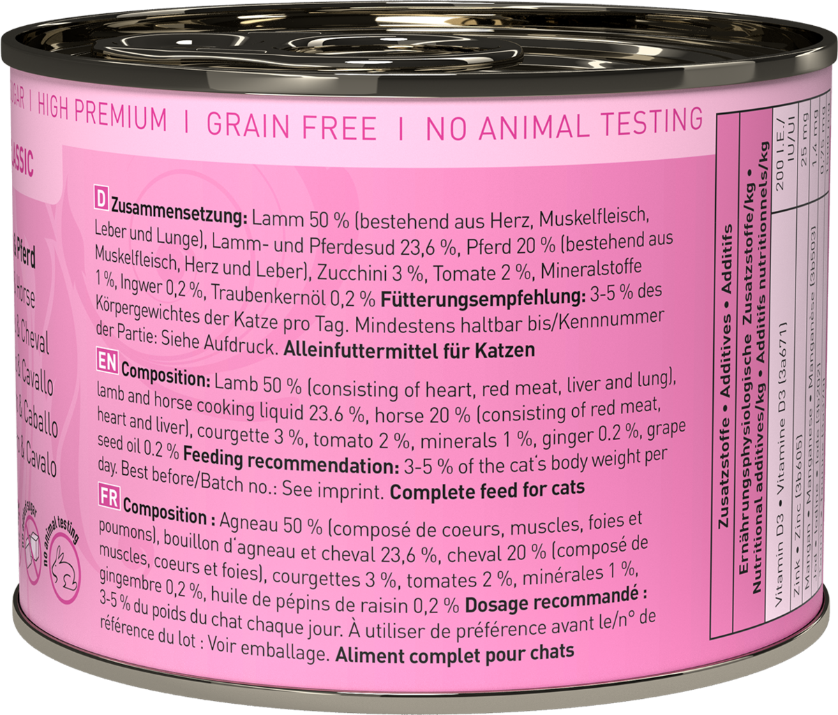 50 % jehněčí (srdce, svalovina, játra, plíce), 23,6 % jehněčí a koňský vývar, 20 % kůň (svalovina, srdce, játra), 3 % cuketa, 2 % rajče, 1 % minerály, 0,2 % zázvor, 0,2 % hroznový olej