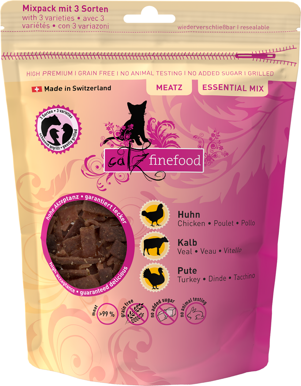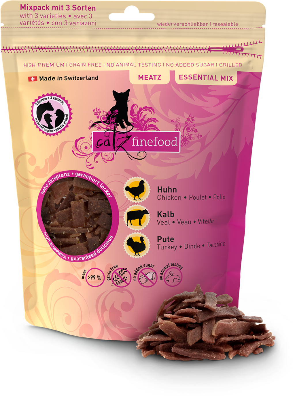 Míca, maso, Meatz? To je jedno, hlavní je, že chutná tak skvěle jako tyto grilované a následně šetrně vzduchem sušené masové proužky, které jsou neodolatelným pamlskem pro Vaši kočku a hýčkají ji obzvláště vysokým podílem masa a v každé variantě další hodnotnou ingrediencí. Zvenku nádherně křupavé, uvnitř jemné a s intenzivním masovým aroma – s touto lákavou odměnou bude i cesta do přepravky hračkou.
