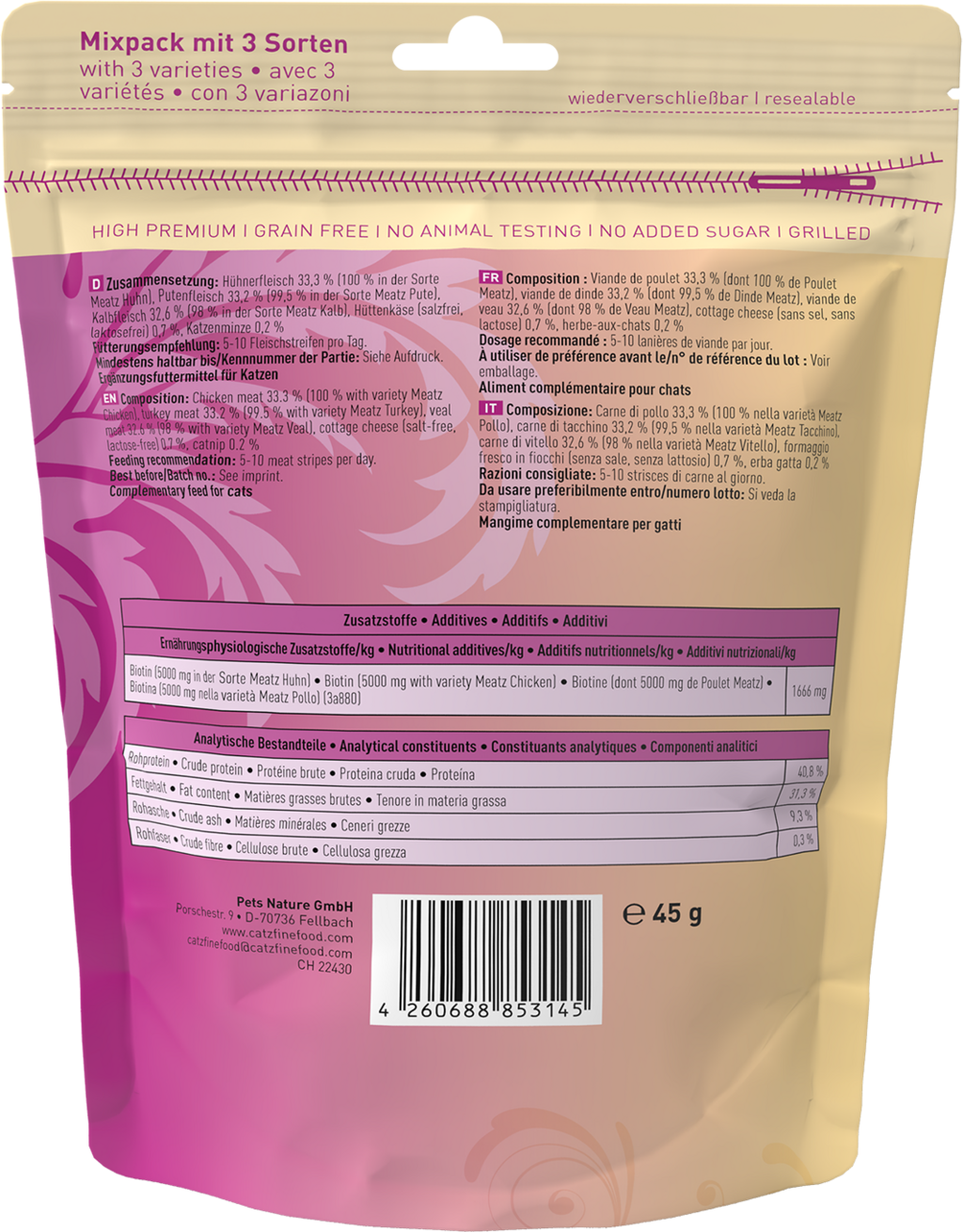 Vlastnosti produktu: bez barviv, bez genetického inženýrství, bez zvýrazňovačů chuti, bez konzervantů, bez umělých barviv, bez umělých barviv a atraktantů, bez umělých příchutě, bez přidaného cukru, bez obilovin, bez lepku, s kočičí mátou, netestováno na zvířatech