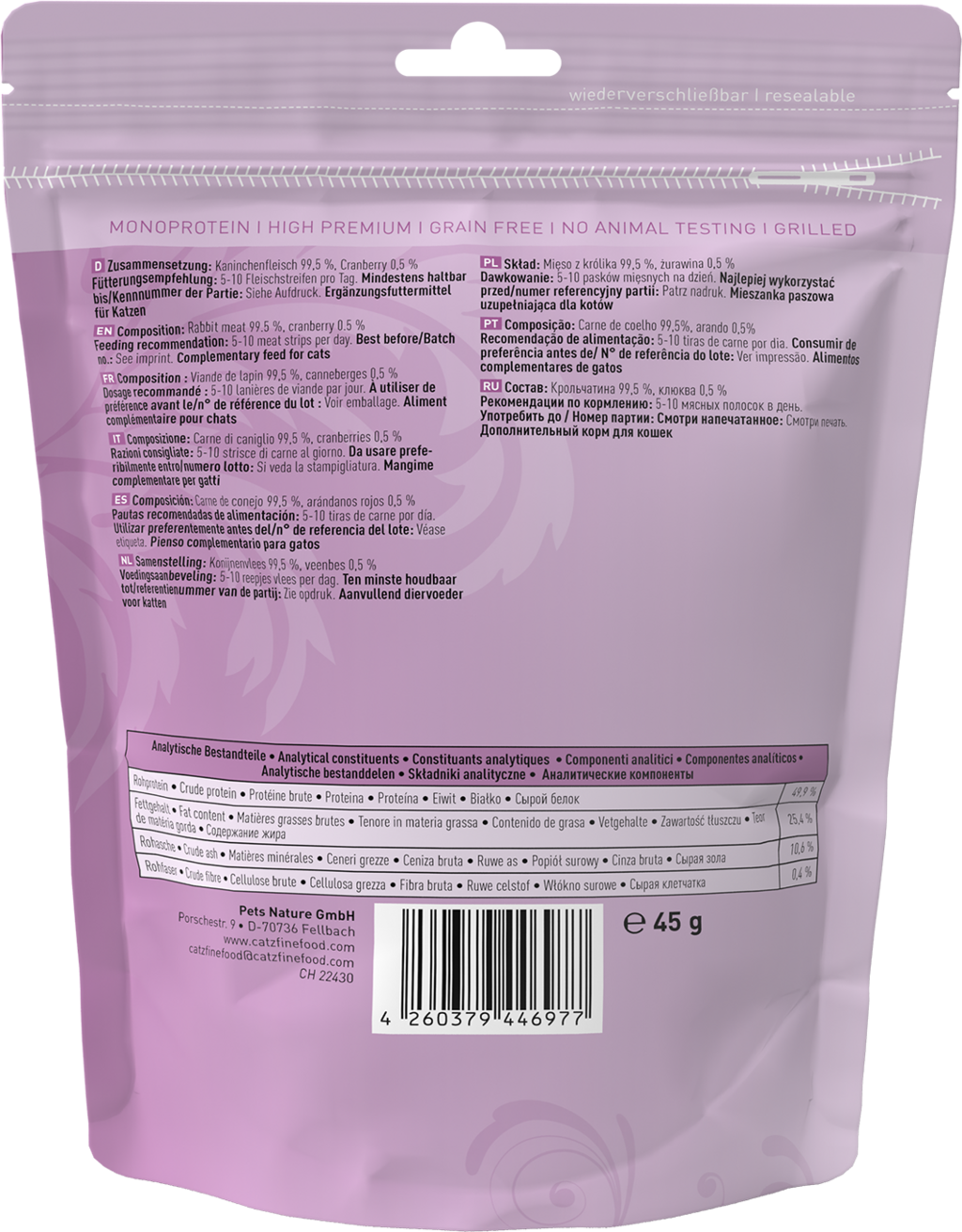 Vlastnosti produktu: bez barviv, bez genetického inženýrství, bez zvýrazňovačů chuti, bez konzervantů, bez umělých barviv, bez umělých barviv a atraktantů, bez umělých příchutě, bez přidaného cukru, bez obilovin, bez lepku, monoproteinové, netestováno na zvířatech