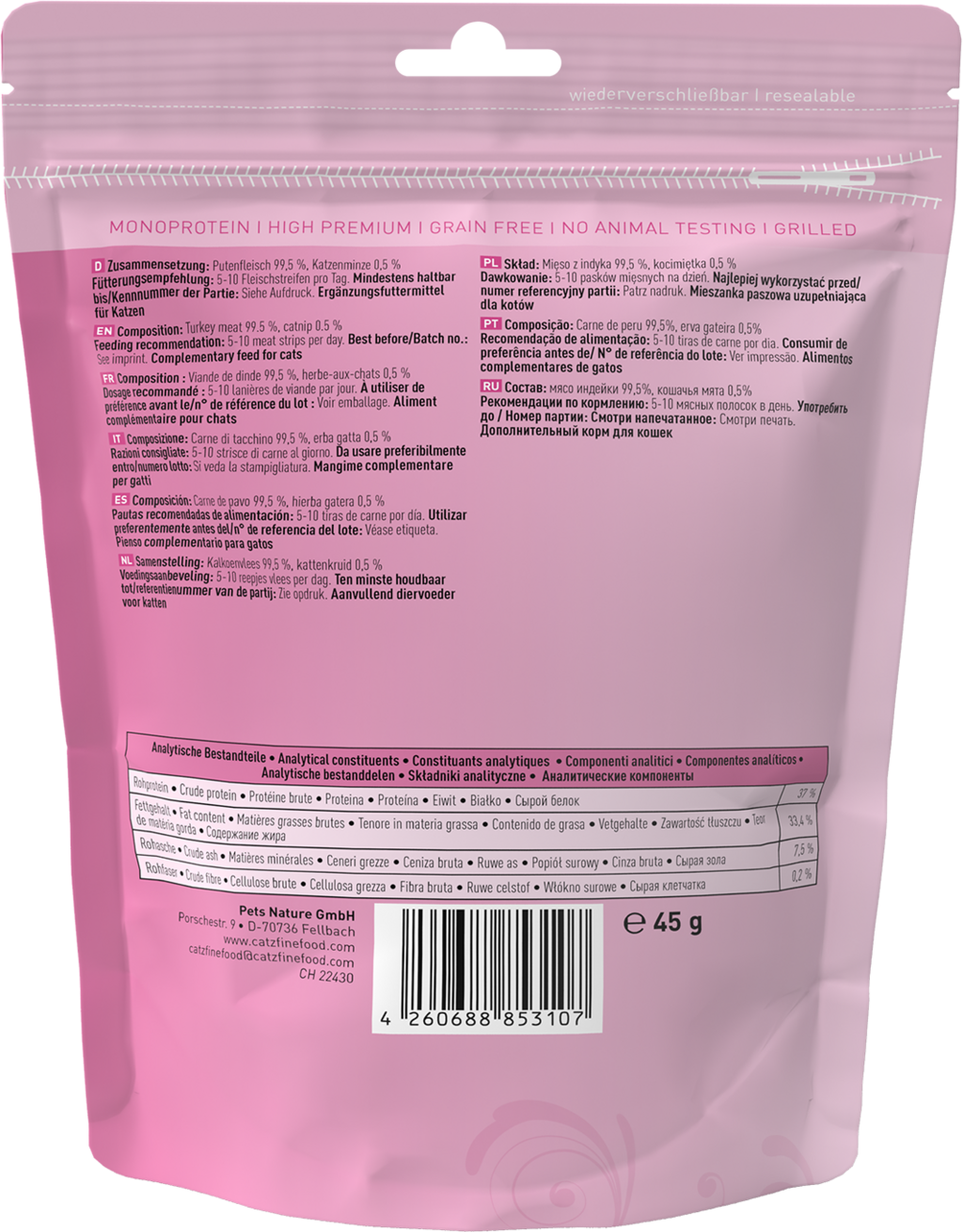 | Vlastnosti produktu: | bez barviv, bez genetického inženýrství, bez zvýrazňovačů chuti, bez konzervantů, bez umělých barviv, bez umělých barviv a atraktantů, bez umělých příchutě, bez přidaného cukru, bez obilovin, bez lepku, s kočičí mátou, monoproteinové, netestováno na zvířatech |