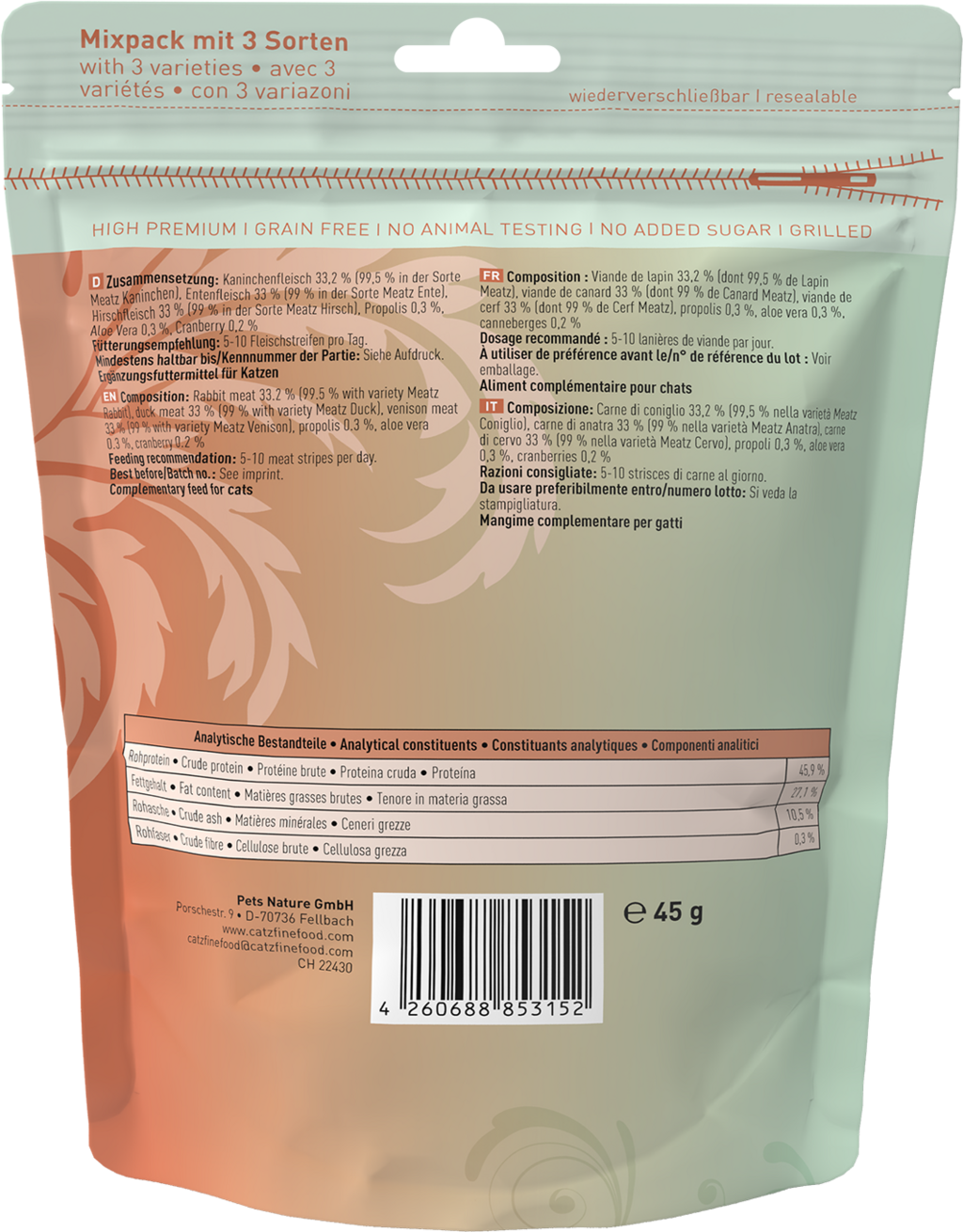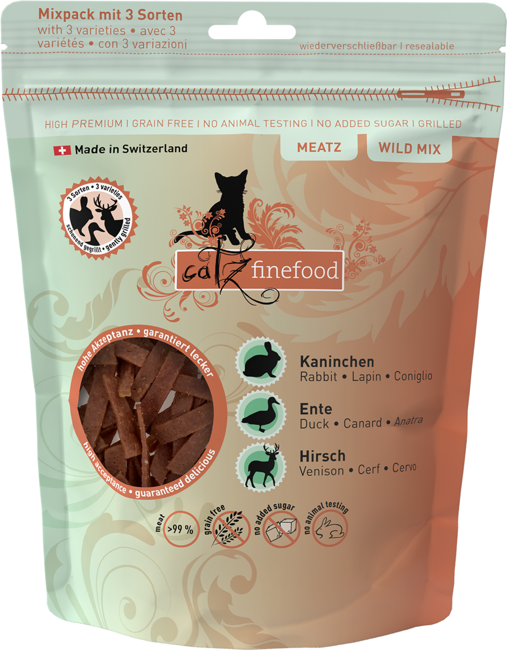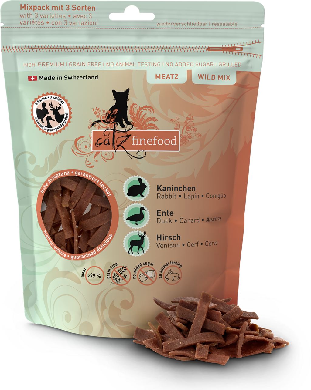 Míca, Meat, Meatz? To je jedno, hlavní je, že chutnají tak skvěle jako tyto grilované a následně šetrně vzduchem sušené masové proužky, které jsou neodolatelným pamlskem pro Vaši kočku a hýčkají ji obzvláště vysokým podílem masa a v každé variantě také další hodnotnou ingrediencí. Zvenku nádherně křupavé, uvnitř jemné a s intenzivním masovým aroma – s touto lákavou odměnou bude i cesta do přepravky hračkou.