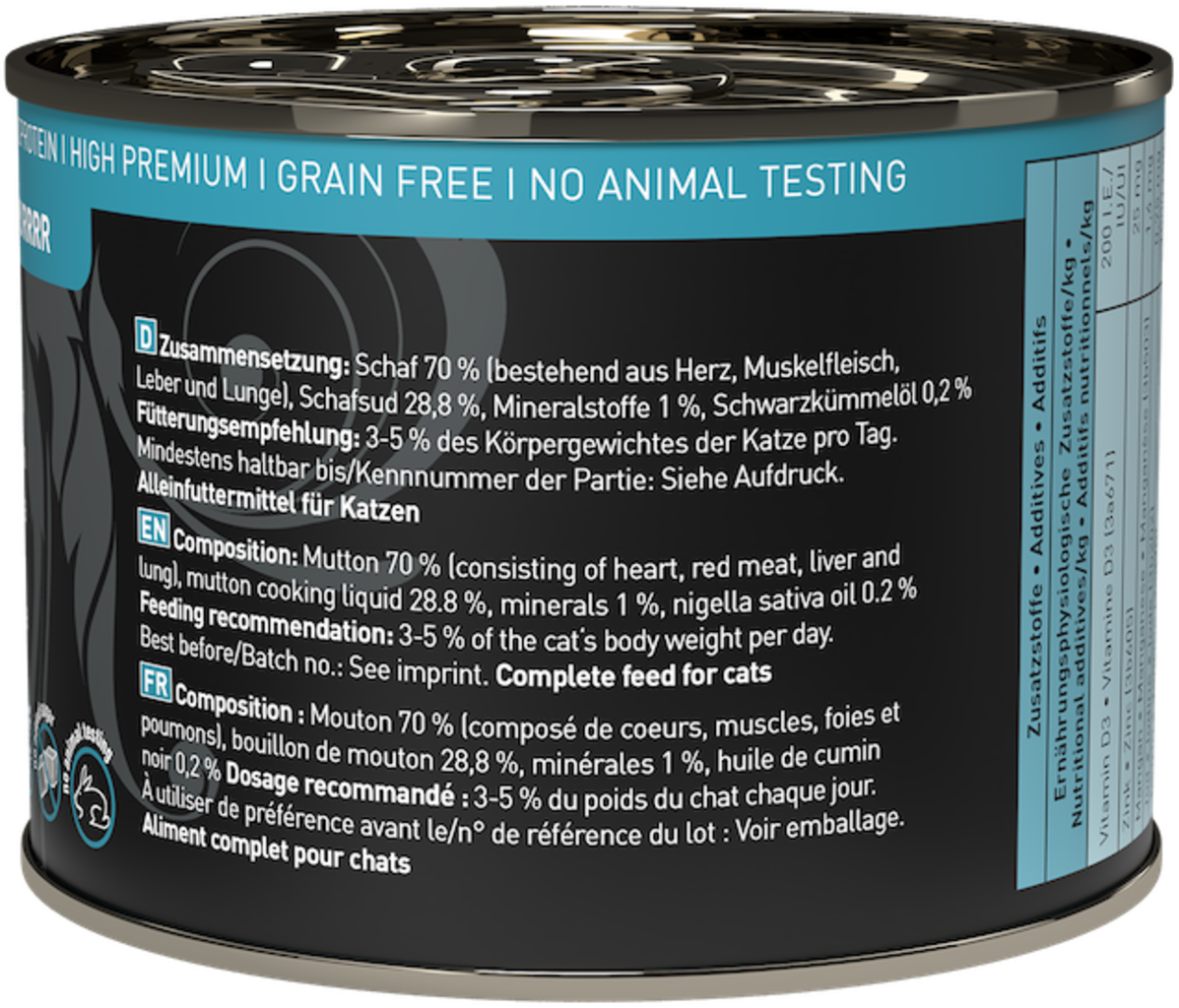 70 % ovce (srdce, svalovina, játra), 28,8 % ovčí vývar, 1 % minerály, 0,2 % olej z černého kmínu