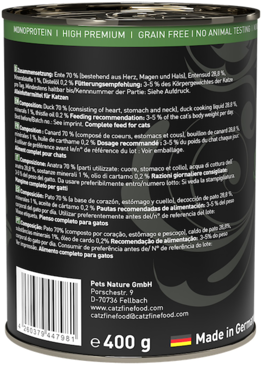 70 % kachna (srdce, žaludek, krk), 28,8 % kachní vývar, 1 % minerály, 0,2 % světlicový olej