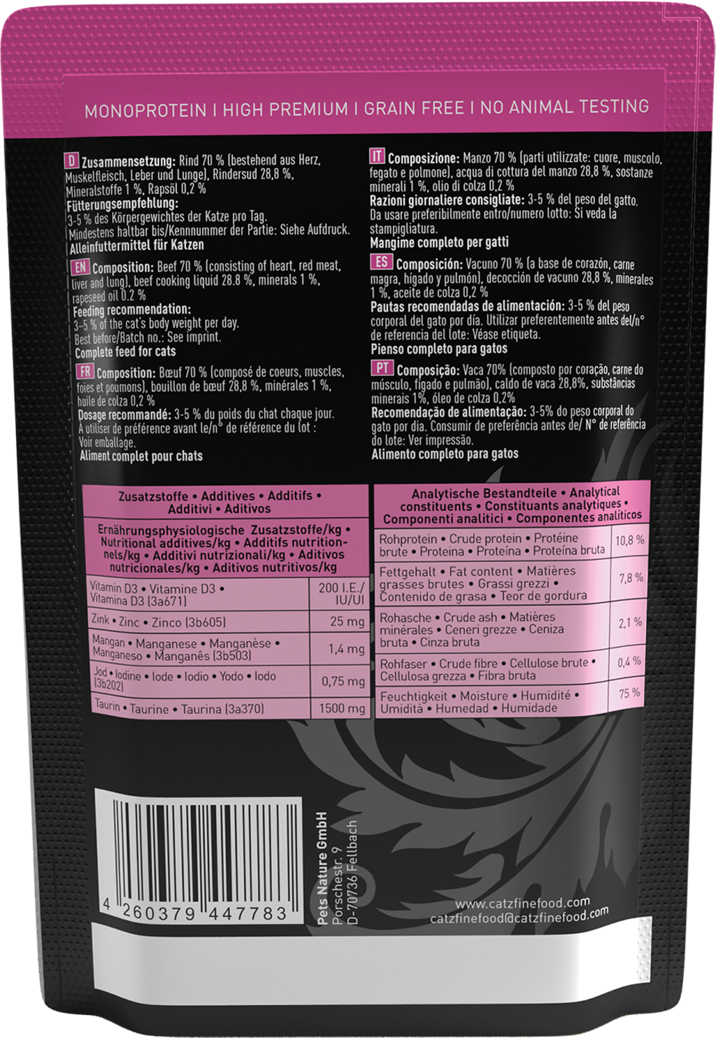 Toto chutné prémiové mokré krmivo zaručeně rozvrní Vaši kočku! Vybrané ingredience, receptura odpovídající přirozeným potřebám založená na konceptu kořisti a zcela bez zbytečných příkras – to je čistý požitek pro Vaši kočku a vynikající základ pro vitální kočičí život.