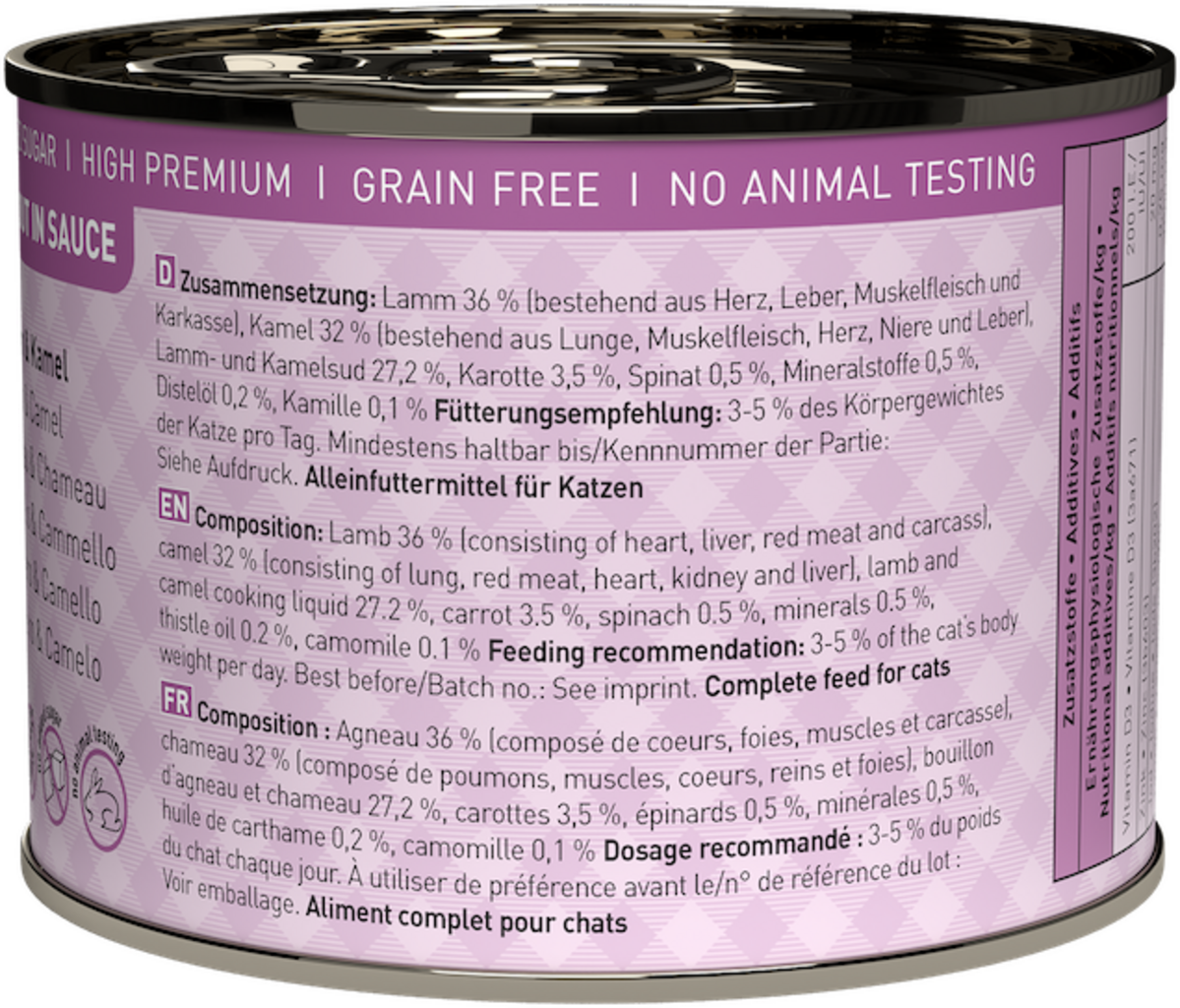 36 % jehněčí (srdce, játra, svalovina, kostra), 32 % velbloud (plíce, svalovina, srdce, ledviny, játra), 27,2 % jehněčí a velbloudí vývar, 3,5 % mrkev, 0,5 % špenát, 0,5 % minerály, 0,2 % světlicový olej, 0,1 % heřmánek
