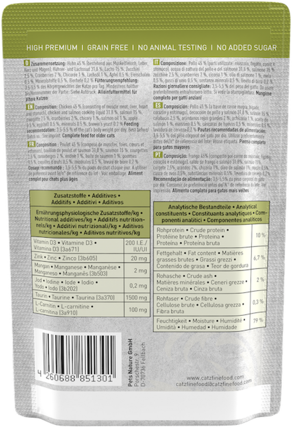 S tímto prémiovým mokrým krmivem můžete svému kočičímu seniorovi dopřát něco zcela výjimečného a hýčkat ho vybranými přírodními ingrediencemi ve vynikající kvalitě a s exkluzivní chutí. Toto krmivo, vytvořené podle konceptu kořisti, respektuje přírodu i specifické potřeby starších koček podle jejich věku, a navrací jim tak kousek původní kvality života.