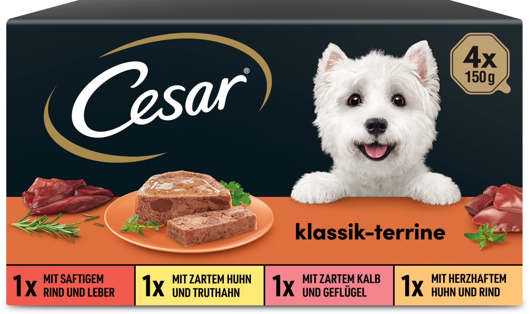 Cesar Klasik terina je neodolatelné mokré krmivo pro dospělé psy: Receptura obsahuje pečlivě vybrané ingredience a je velmi bohatá. Díky pevné konzistenci s výraznými masovými kousky si každý psí gurmán užije opravdový chuťový zážitek a šťavnaté želé jej potěší. Vláčnost a vysoký obsah bílkovin dělá z každodenní porce vyvážené krmivo.