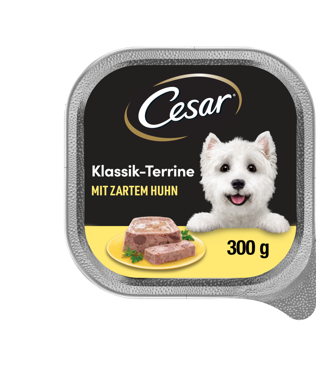 Cesar terina je neodolatelné mokré krmivo pro dospělé psy: Receptura obsahuje pečlivě vybrané ingredience a je velmi bohatá. Díky pevné konzistenci s výraznými masovými kousky si každý psí gurmán užije opravdový chuťový zážitek, zatímco šťavnaté želé potěší jeho jazyk. Vláčnost a vysoký obsah bílkovin dělá z každodenní porce vyvážené krmivo.