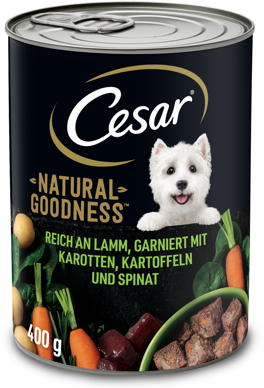S Natural Goodness terina ukazuje Cesar, na čem ve psí misce skutečně záleží: na přírodních ingrediencích, vyvážených porcích a neodolatelně chutných recepturách. Díky jemnému jehněčímu a superpotravinám, jako jsou mrkev, brambory a špenát, vykouzlí toto mokré krmivo úsměv na tváři každého psího gurmána.