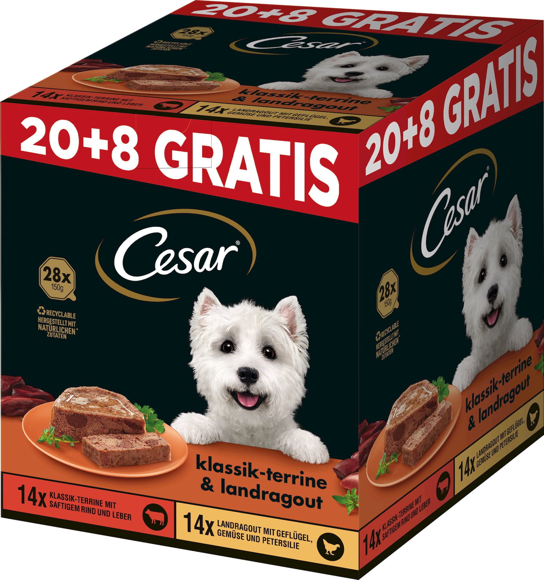 Multipack pro pestrou skladbu jídelníčku: V balení najdete 14 ks Cesar klasické teriny a 14 ks Cesar venkovského ragú. Můžete tak svého psa rozmazlovat buď pevnou terinou v želé nebo šťavnatými masovými kousky v omáčce - obě varianty jsou skutečným gurmánským zážitkem. Všechny ingredience jsou pečlivě vybrané a šetrně zpracované; textury jsou jemné a chuť výrazná.