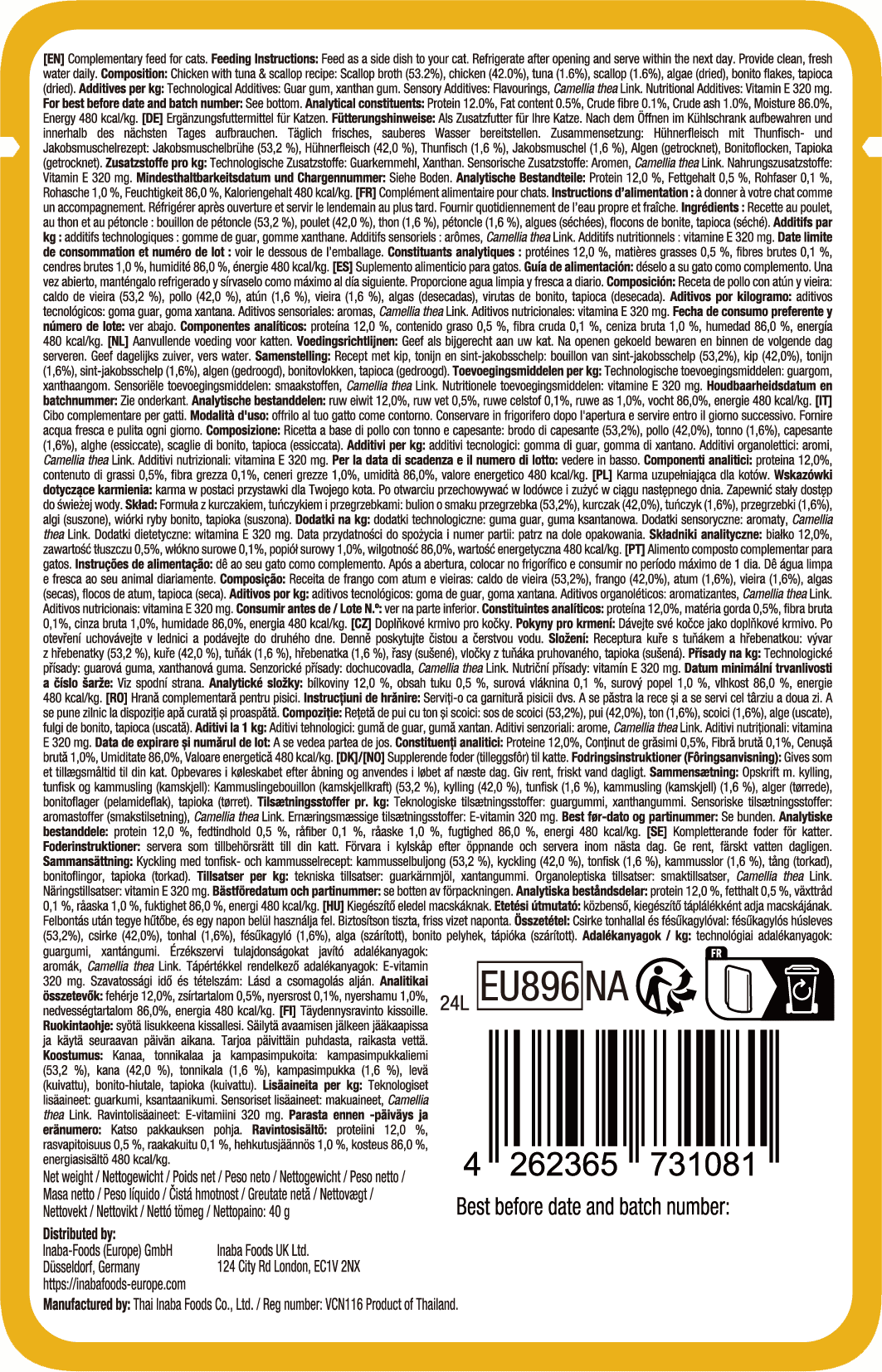 53,4 % vývar z hřebenatek, 41,8 % Kuřecí maso, 1,6 % tuňák, 1,6 % hřebenatky, vločky bonito, sušená tapioka, agar, guarová guma, xanthan
