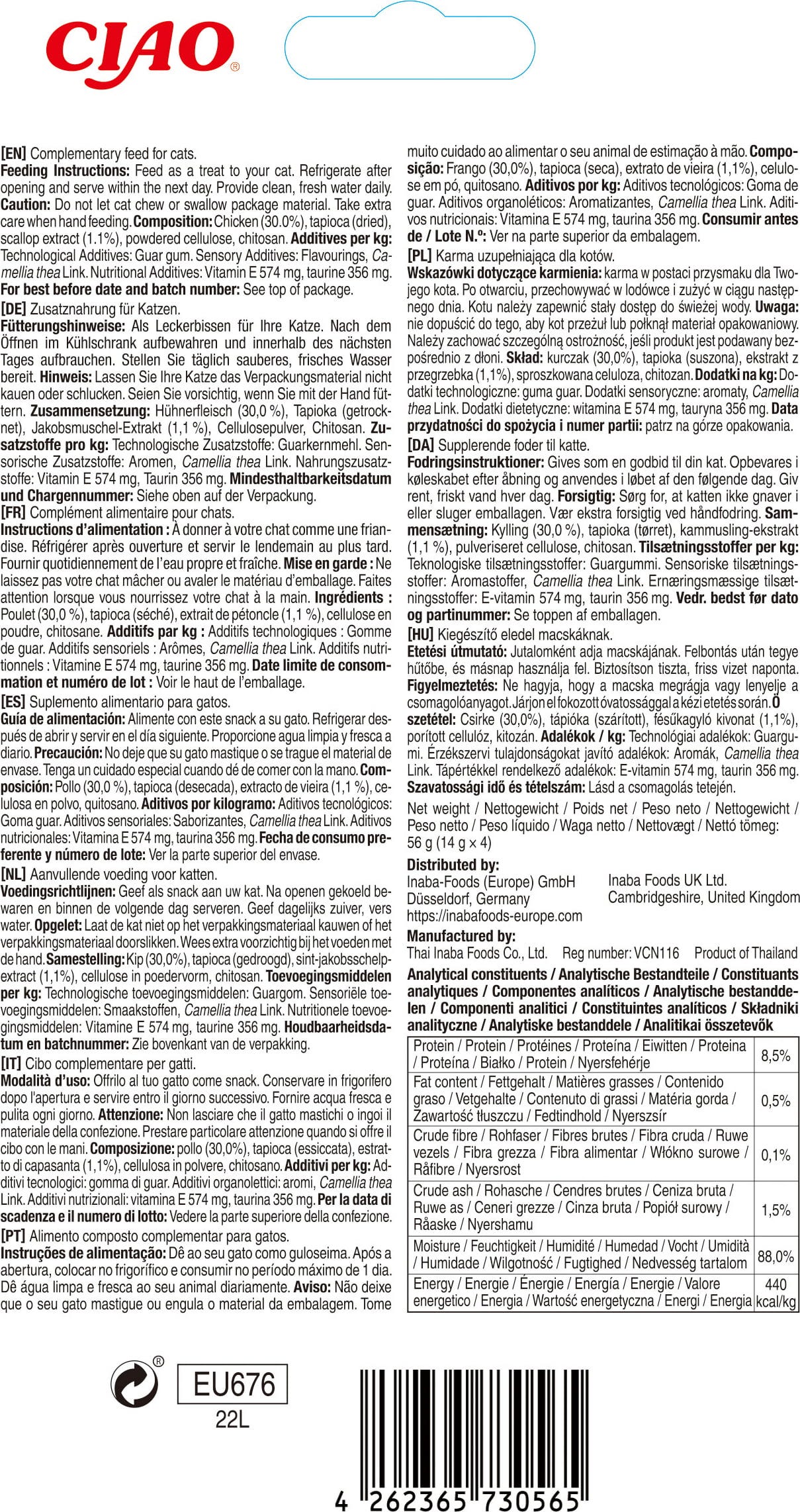 30 % Kuřecí maso, sušená tapioka, 1,1 % extrakt z hřebenatek, celulóza v prášku, chitosan