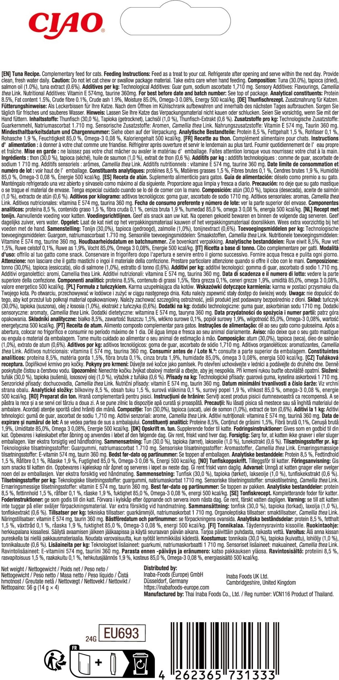 30 % tuňák, sušená tapioka, 1 % lososový olej, 0,6 % extrakt z tuňáka