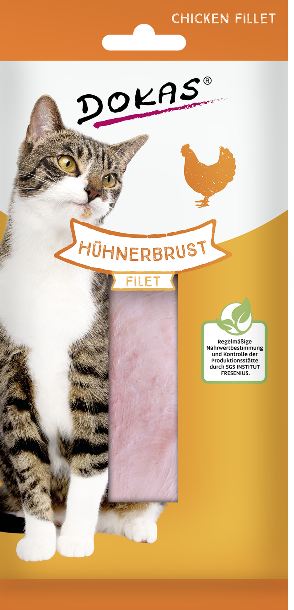 100% šťavnatý Dokas kuřecí prsní filet – nebeský požitek, kterému neodolá žádná kočka. Ideální pamlsek pro hýčkání i pro nutričně citlivé domácí mazlíčky.