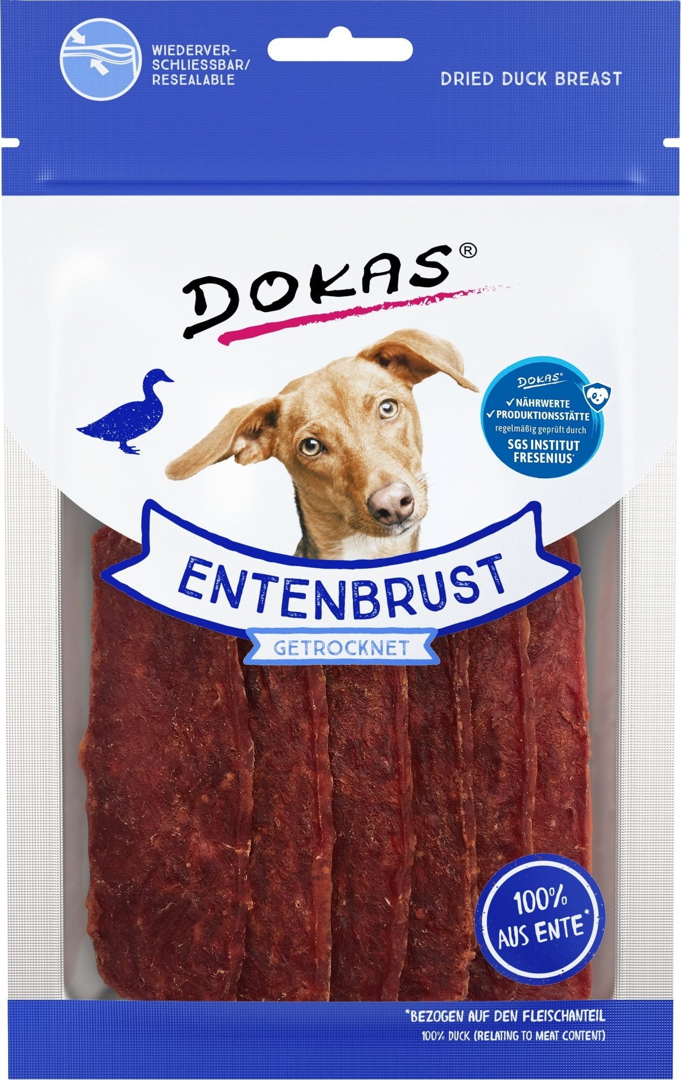 Aromatickým a vzduchem sušeným masovým proužkům Dokas neodolá žádný pes! Jsou vyrobeny ze 100% vysoce kvalitního kachního prsního filé* a představují skvělou svačinku mezi jídly. Zcela výjimečný požitek, který zaručeně vykouzlí věrný psí pohled.