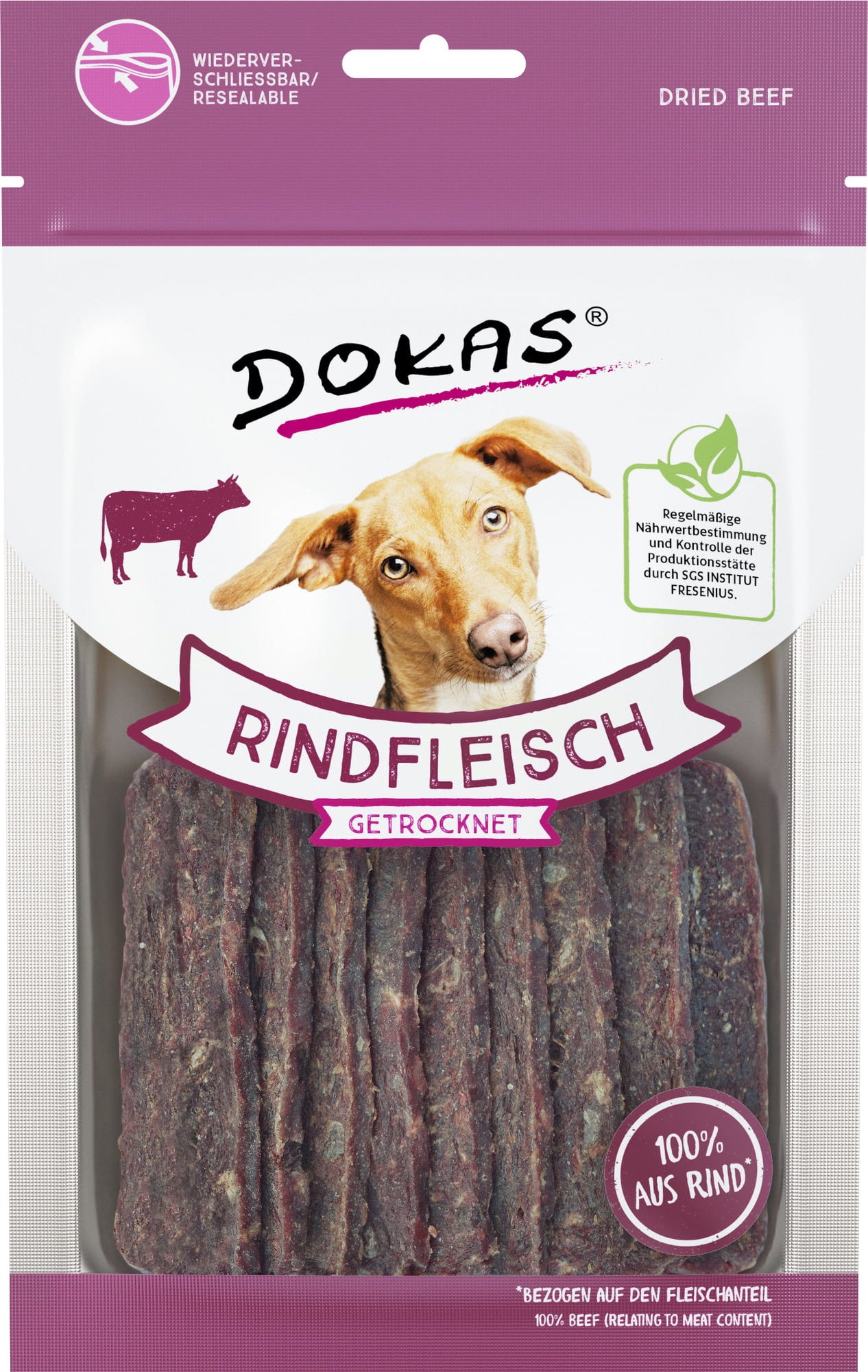 Aromatickým a vzduchem sušeným masovým proužkům Dokas neodolá žádný pes! Skládají se ze 100 % kvalitního hovězího masa* a představují skvělý pamlsek mezi jídly. Zcela výjimečný požitek, který zaručeně zajistí věrné psí pohledy.