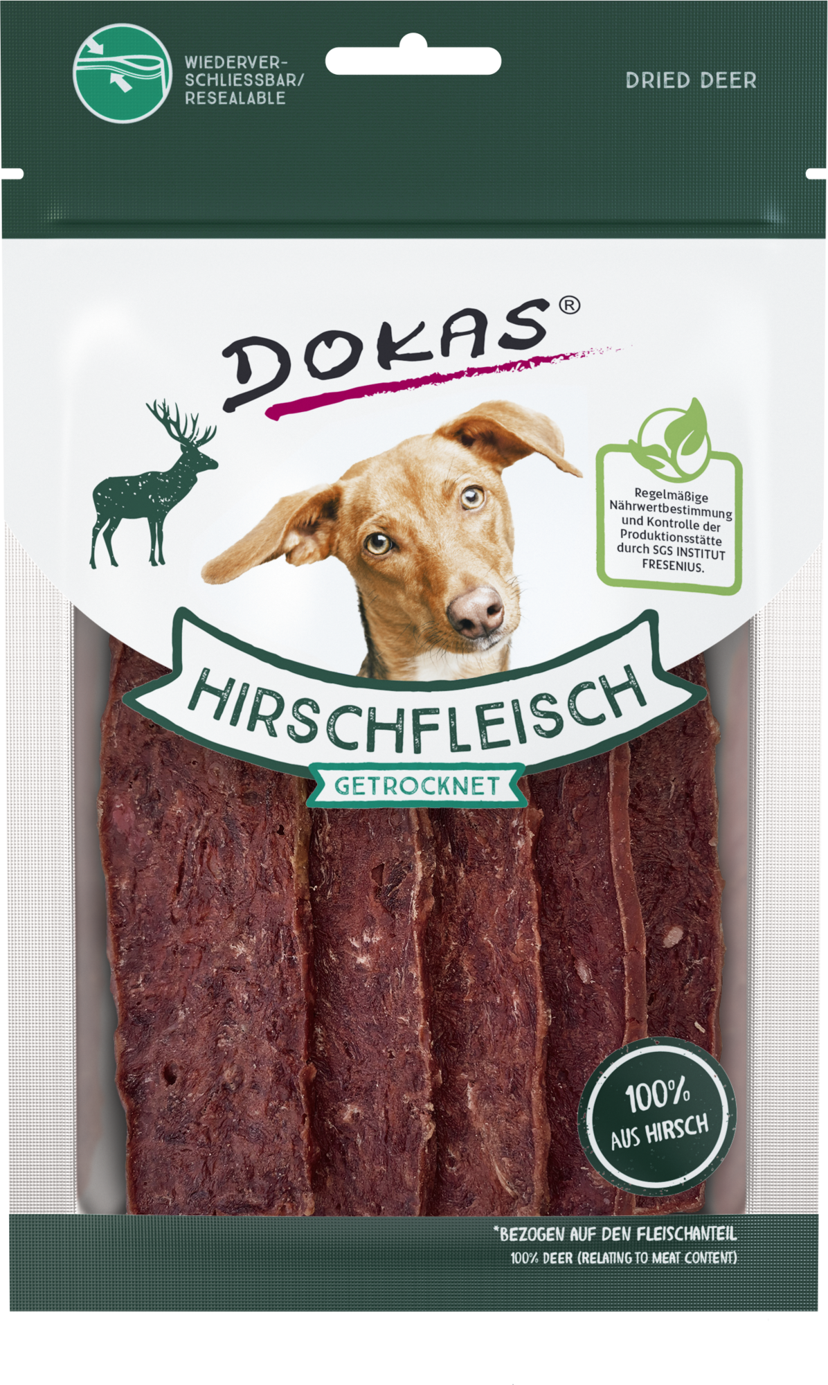 Aromatickým a vzduchem sušeným masovým proužkům Dokas neodolá žádný pes! Skládají se ze 100 % kvalitního jeleního masa* a představují skvělý pamlsek mezi jídly. Zcela výjimečný požitek, který zaručeně zajistí věrné psí pohledy. Ideální také pro nutričně citlivé psy.