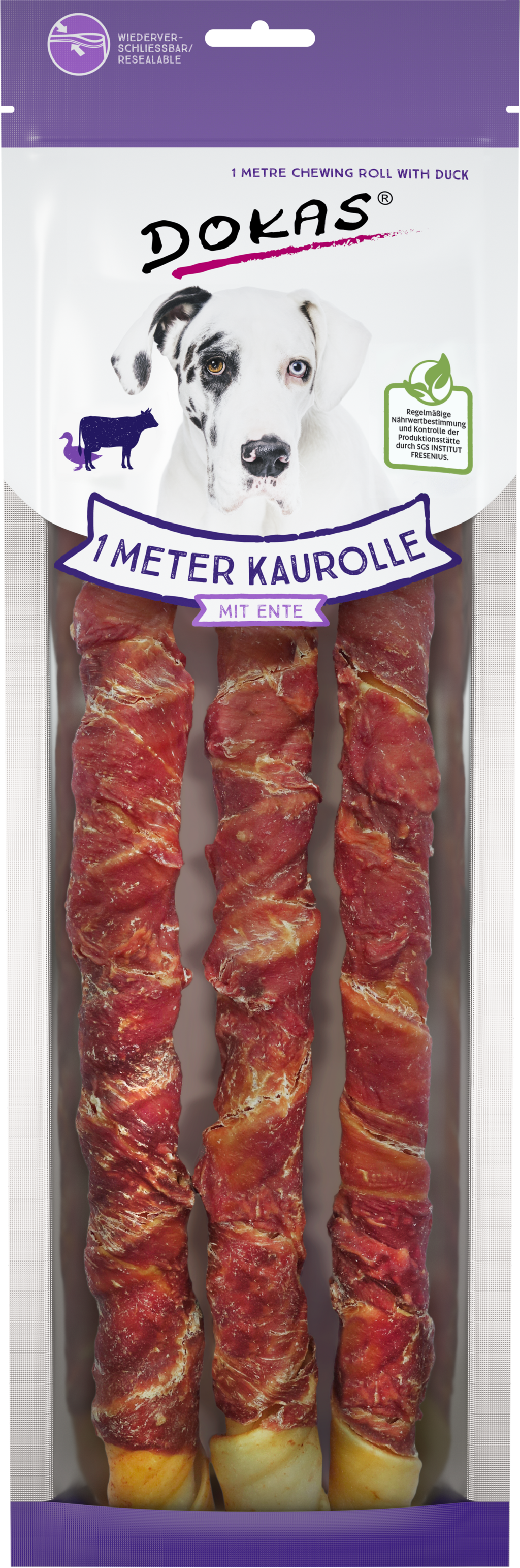Dokas žvýkací role 1 metr nabízí obzvláště dlouhou zábavu při žvýkání. Vydatná hovězí kůže, obalená jemným filetem z kachních prsou, přesvědčí i svou chutí a představuje ideální odměnu pro Vašeho psa.
