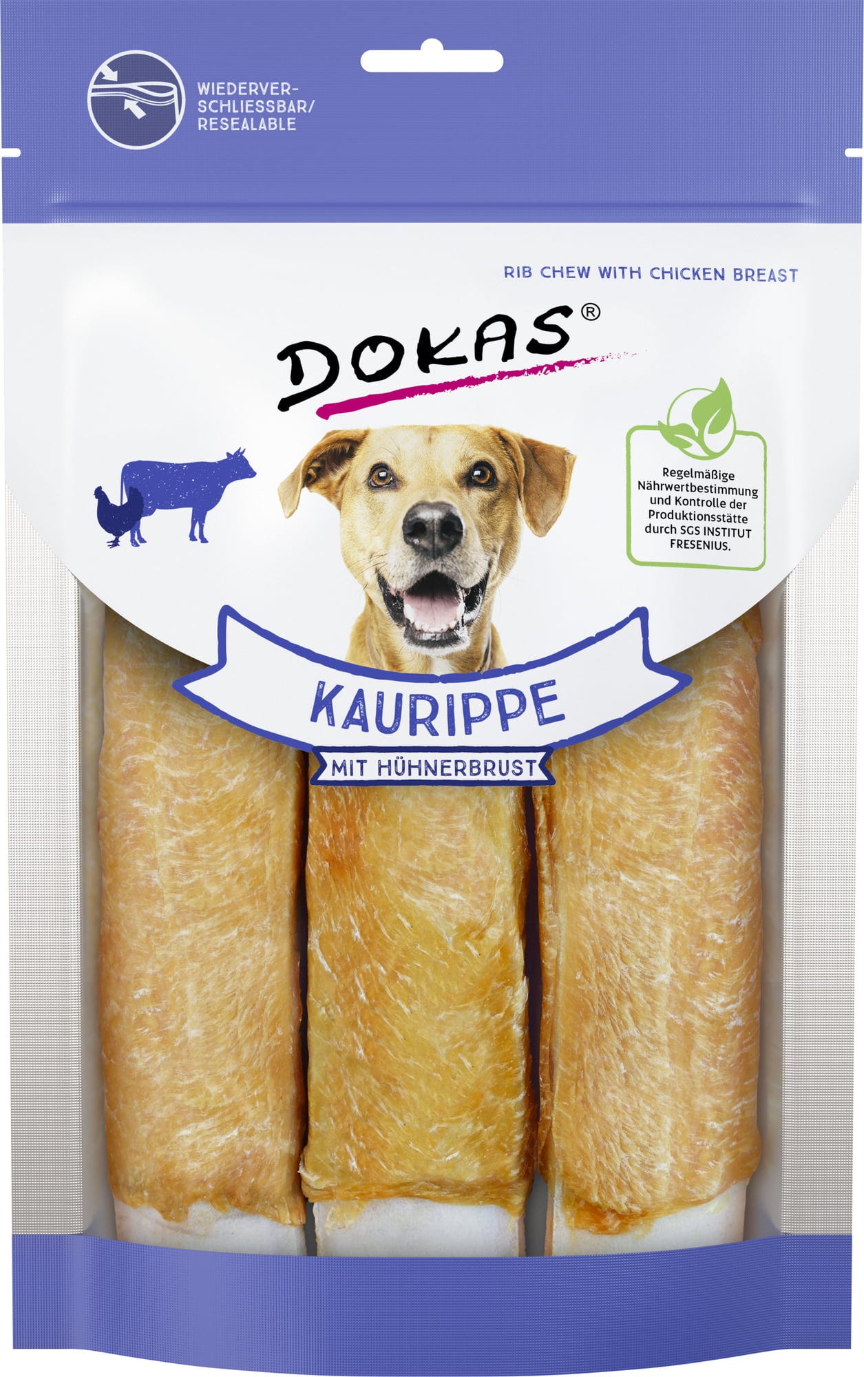 Dokas - žvýkací žebírko se skládá z hovězí kůže obalené jemným filetem z kuřecích prsou. Představuje obrovskou zábavu při okusování a žvýkání a je ideální odměnou pro Vašeho psa. Intenzivní žvýkání posiluje svalstvo a může přispívat ke každodenní péči o chrup.