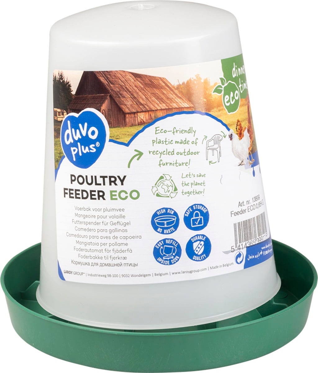 Ekologické Eco krmítko od duvoplus je něco úplně jiného! Toto odolné a robustní krmítko pro drůbež je skutečně vyrobeno z recyklovaného zahradního nábytku, a tak prospívá nejen drůbeži, ale i životnímu prostředí!