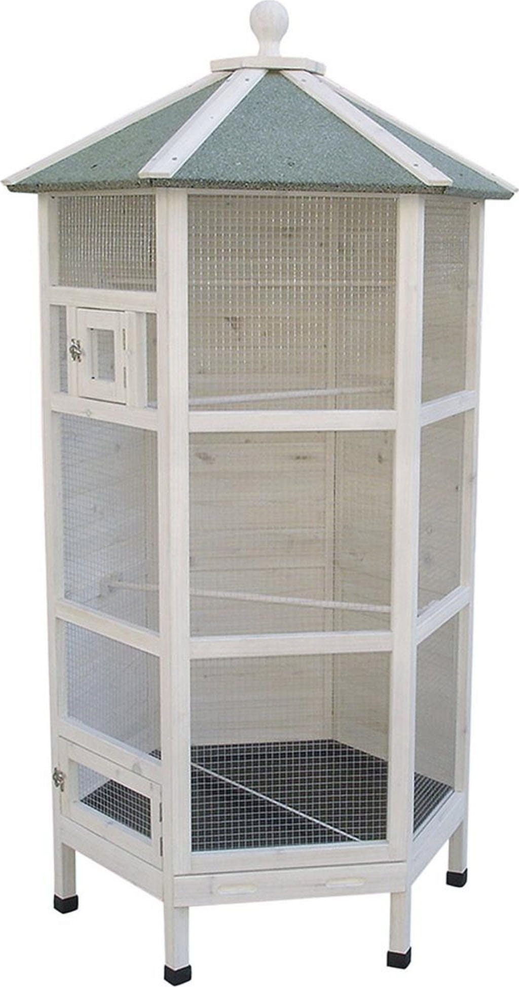 Tato voliéra od duvoplus je skutečným šperkem ve Vaší zahradě nebo na dvoře! Je vyrobena z borového dřeva, vysoce kvalitně a pečlivě zpracovaná, a disponuje dvěma velkými dvířky a praktickými vysouvacími přihrádkami pro snadné čištění. Uvnitř se nabízejí 2 bidla a místo celkem pro 7 ptáků; střecha je vyrobena z profesionální střešní krytiny a odolá každému dešti.