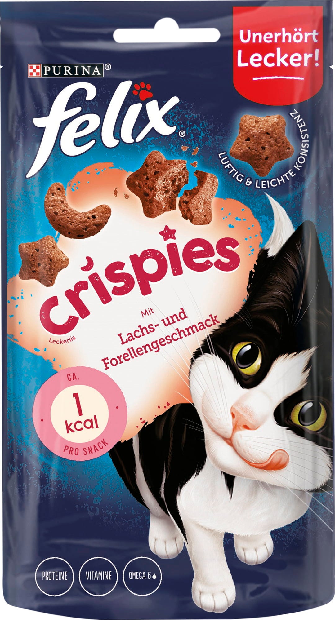 Křup, křup - nepřekonatelné chutě! Felix Crispies přinášejí výjimečné chuťové zážitky a probouzejí ve Vaší kočce šelmu! Nadýchaná konzistence křupavých polštářků s příchutí lososa a pstruha zaujme na první kousnutí - a navíc neobsahuje žádná umělá barviva.