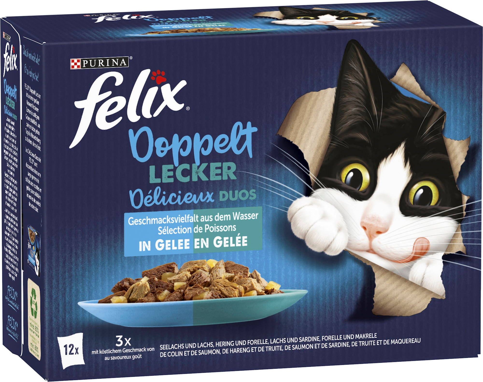 Balení Doppelt Lecker obsahuje 12 kapsiček po 85 g mokrého krmiva: